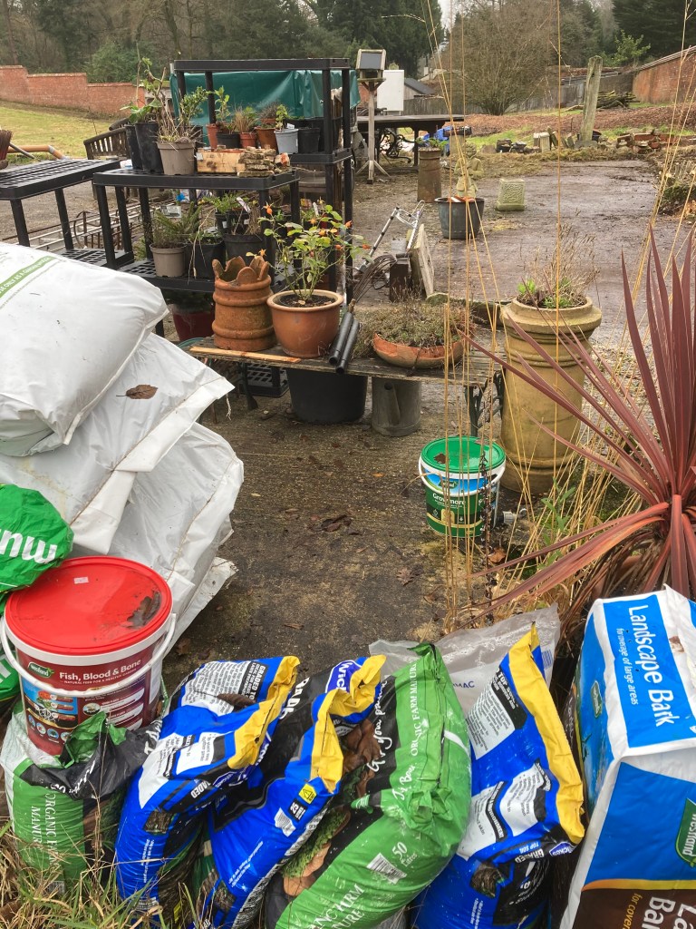 Our new neighbours must be wondering who’s moved in as the garden and garage contents from Salisbury and Woolacombe are dumped in the garden. Looks like a scrapyard! The hardstandings for old poultry sheds and stables provide the perfect places for our temporary set up of caravan, office container and storage.
