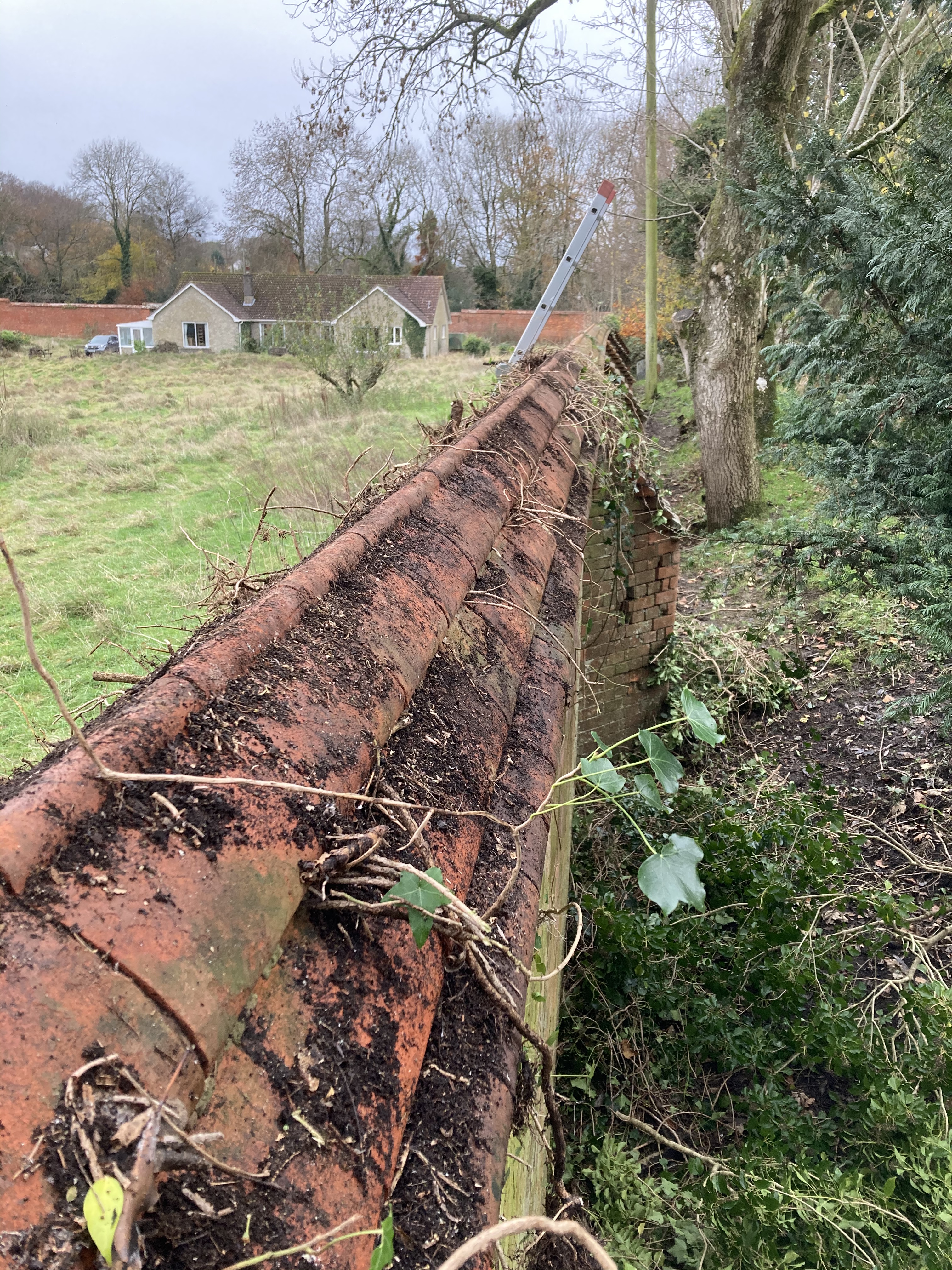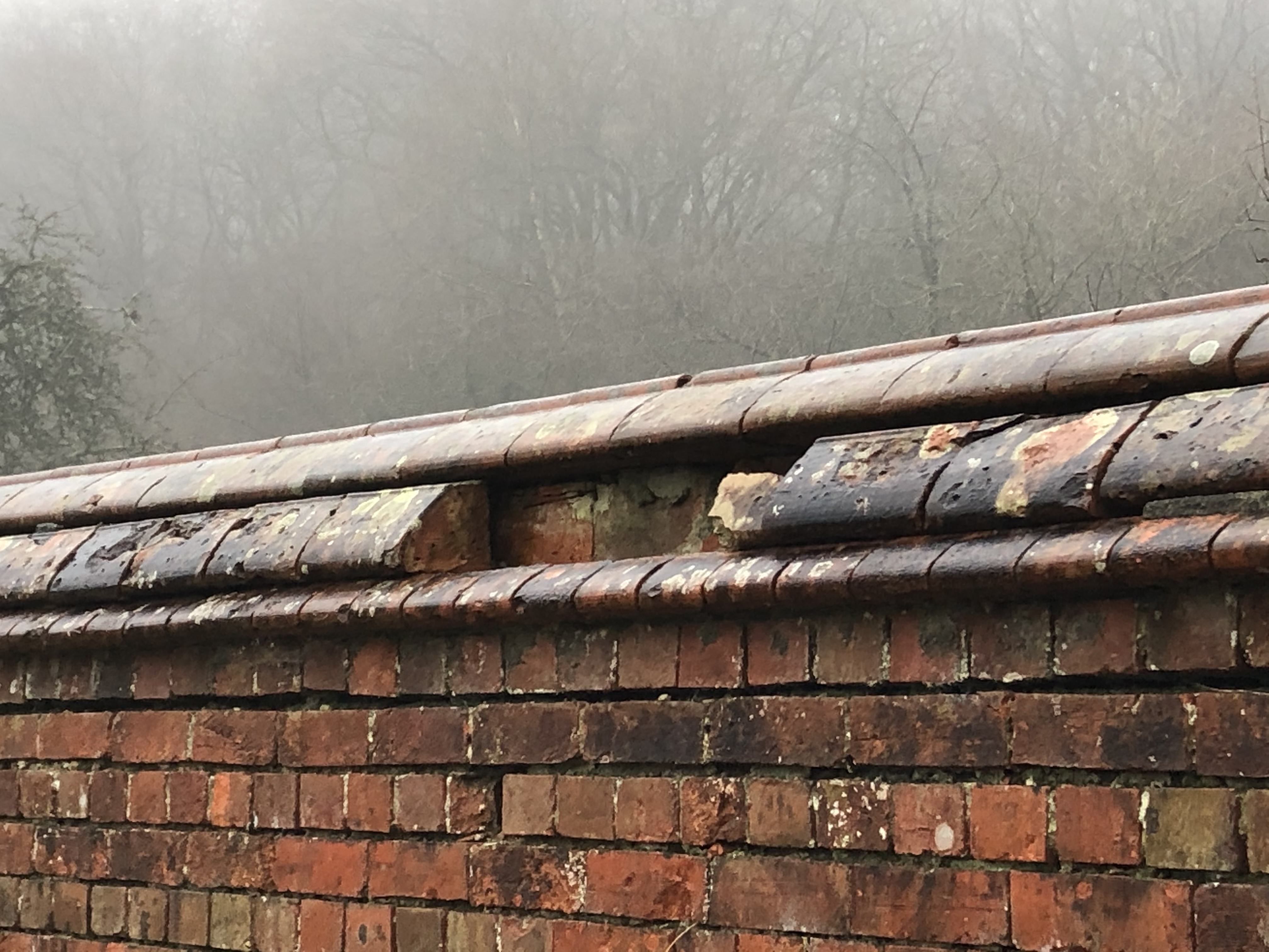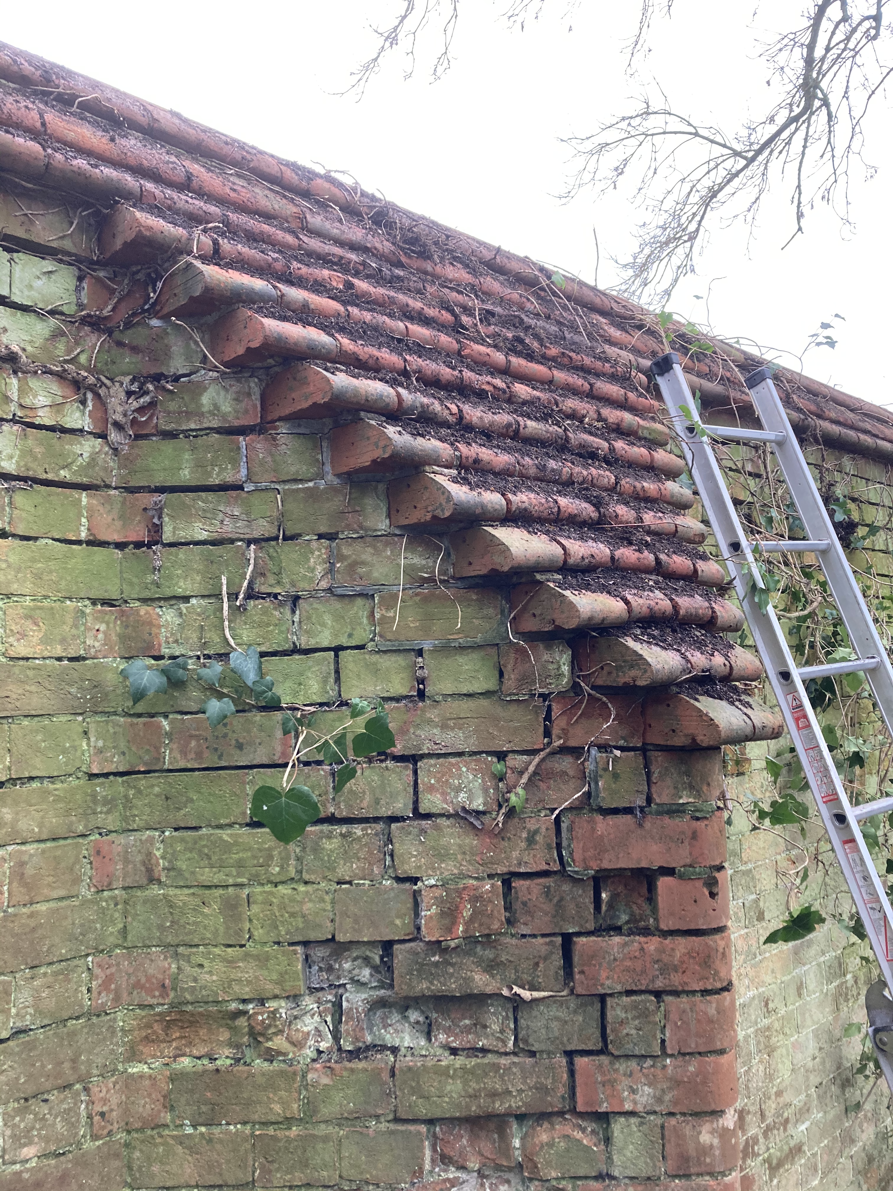 The ivy-stripping is revealing sone beautiful stretches of wall and its supporting angular buttresses. The damage to the bricks beneath the ivy isn’t too bad but there are still plenty of areas that need repair. We’ll have to have replacements specially made, we think.