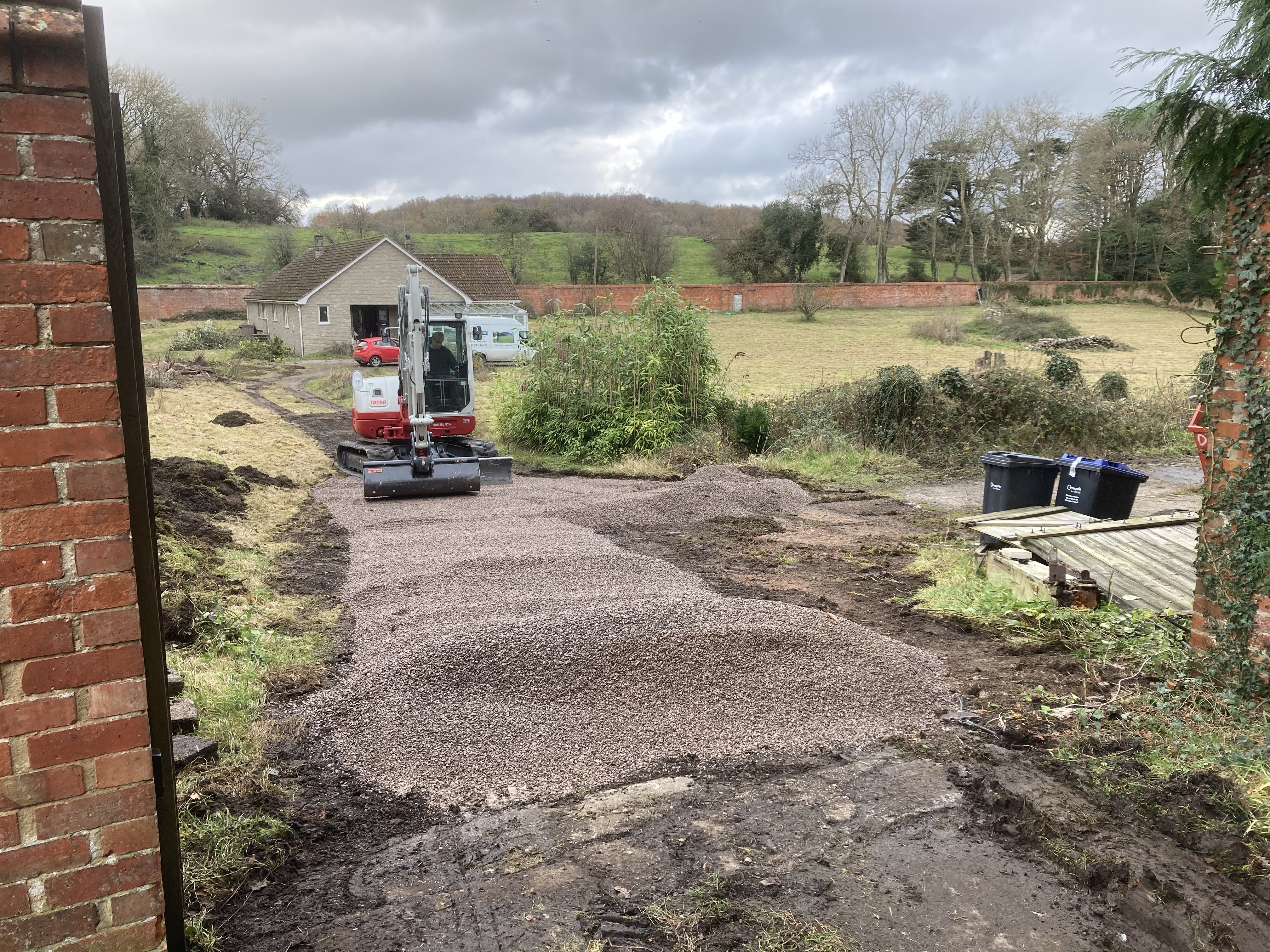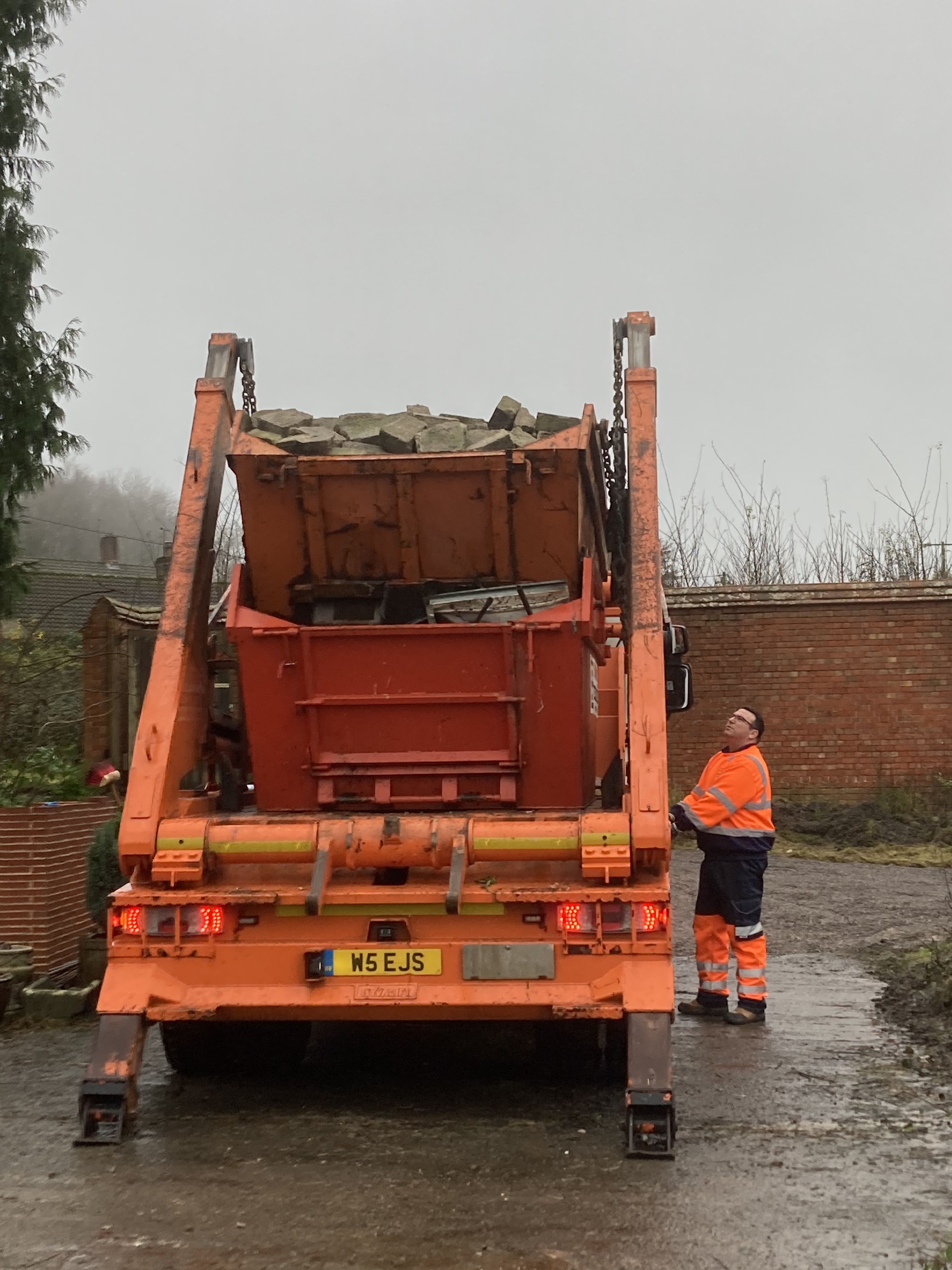 Two skips arrived from EJ Shanley; one for rubble – inerts only! – and one ‘free of charge’ for scrap metal. Chris had said ‘no’ to off-site waste disposal but we needed to clear some room for a storage container. The skip lorry driver had trouble getting out and asked if we can do something about the slippery, muddy entrance. We’ve ordered six tonnes of limestone to be delivered on Monday that needs to be spread before the skips go on Tuesday which need to be out of the way before the caravan arrives on Wednesday etc etc…