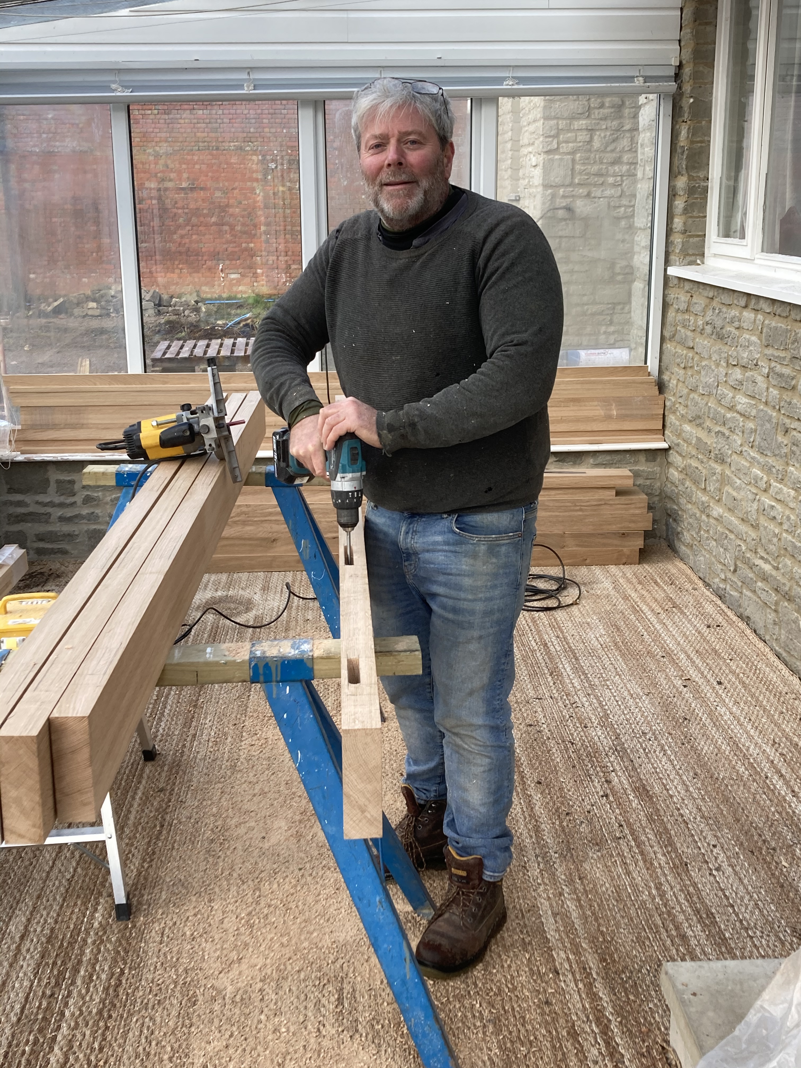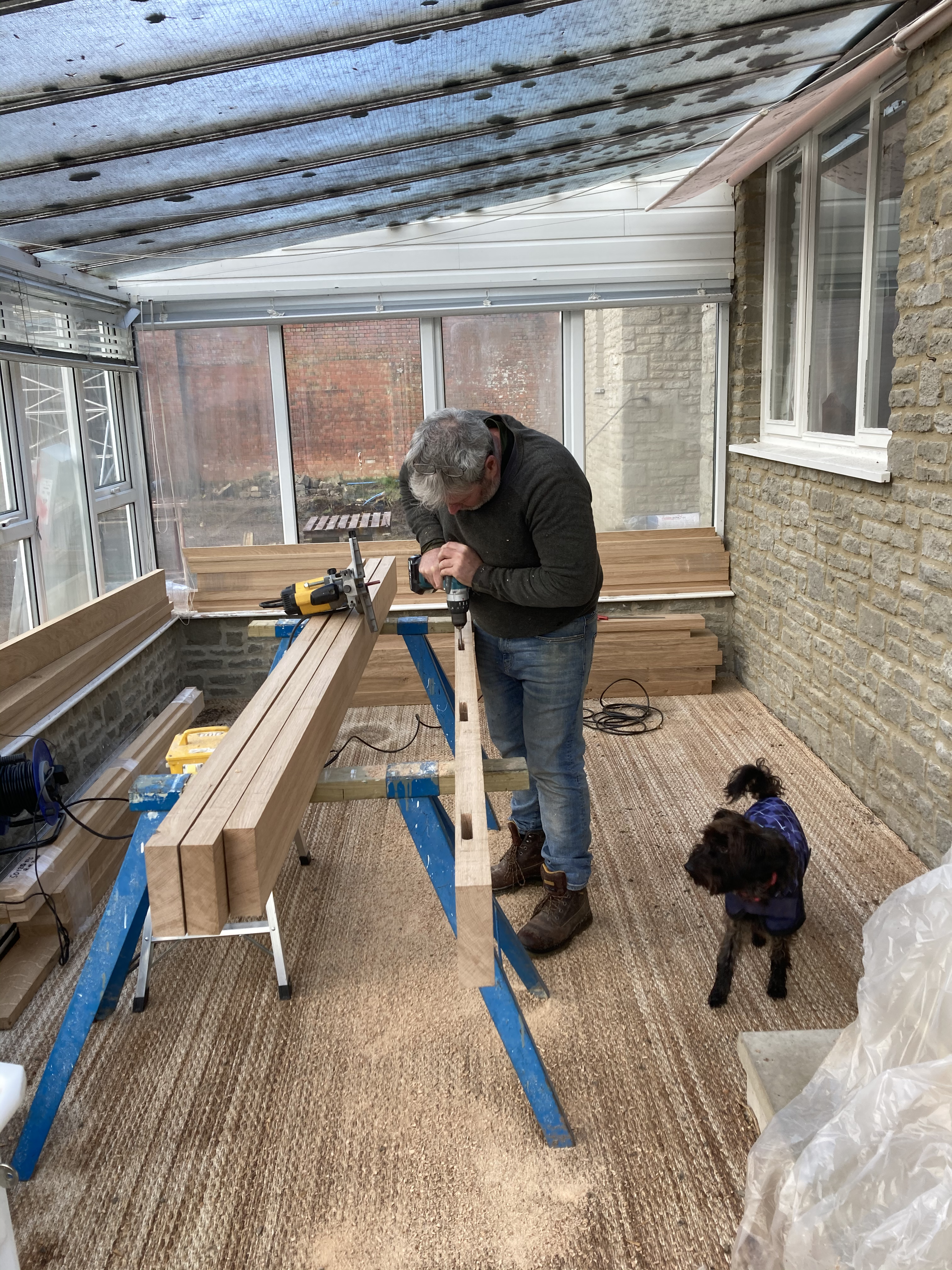 With some help from Dulcie, Dave has made a start on the new oak gates for the west gate, with his temporary set-up in the bungalow conservatory.
