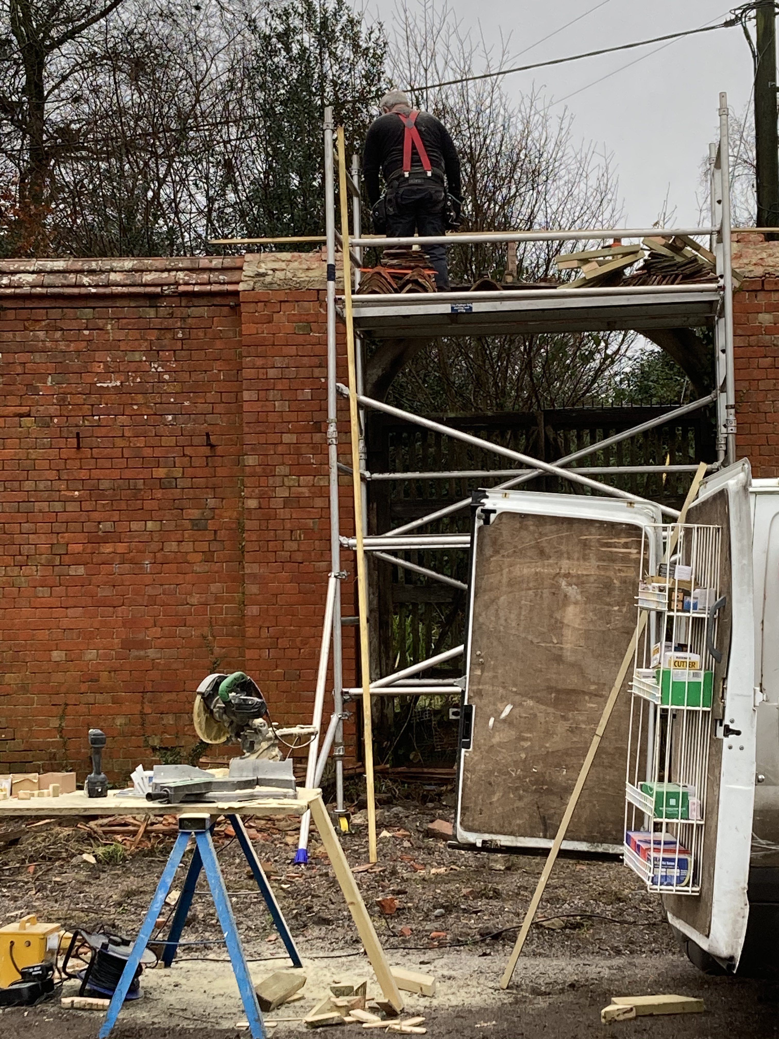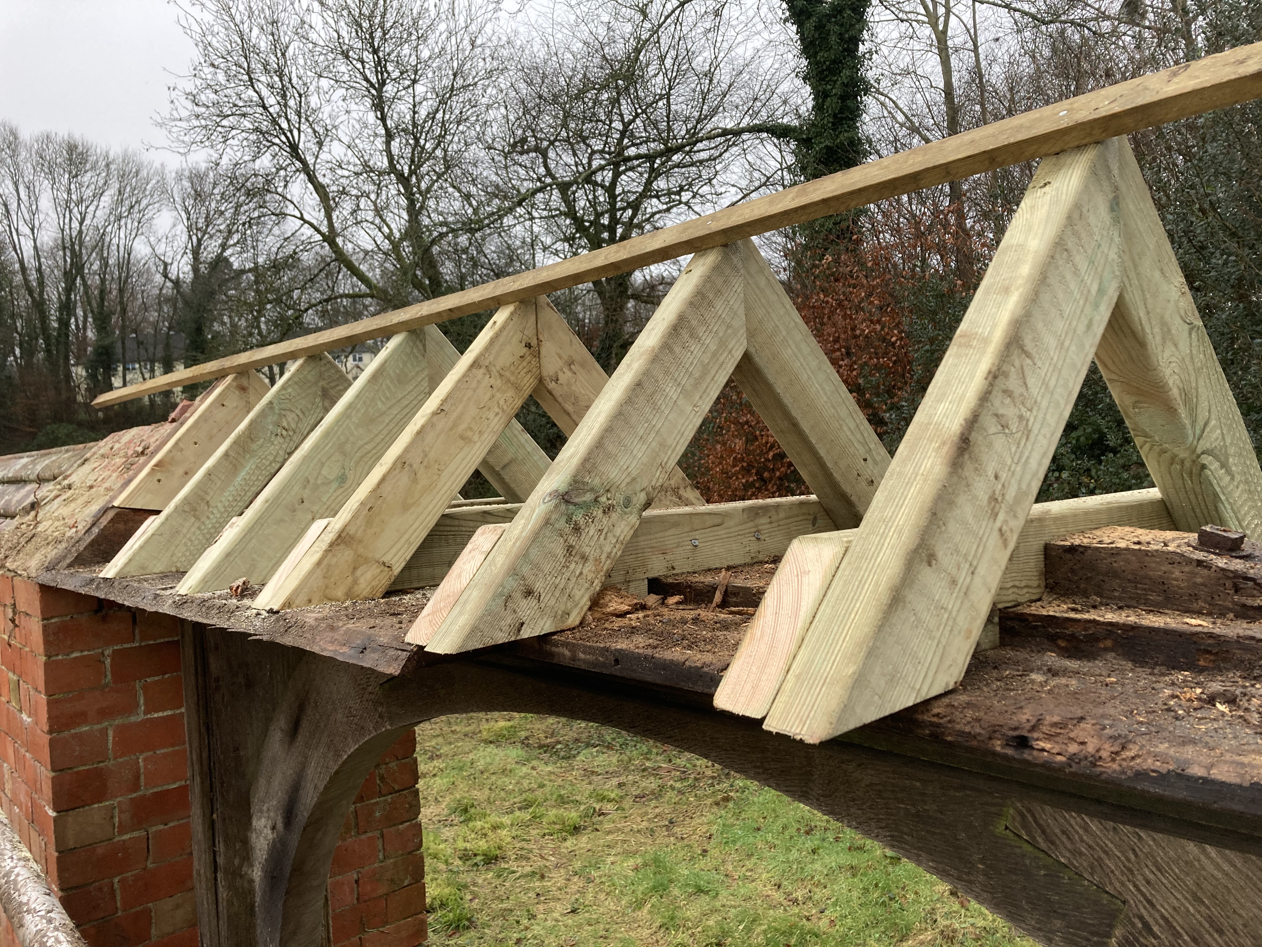 Back to work today. The new framework for the roof of the west gate is now in place. This will be finished with felt, battens and tiles in the New Year. Dave has perhaps had some new braces for Christmas.