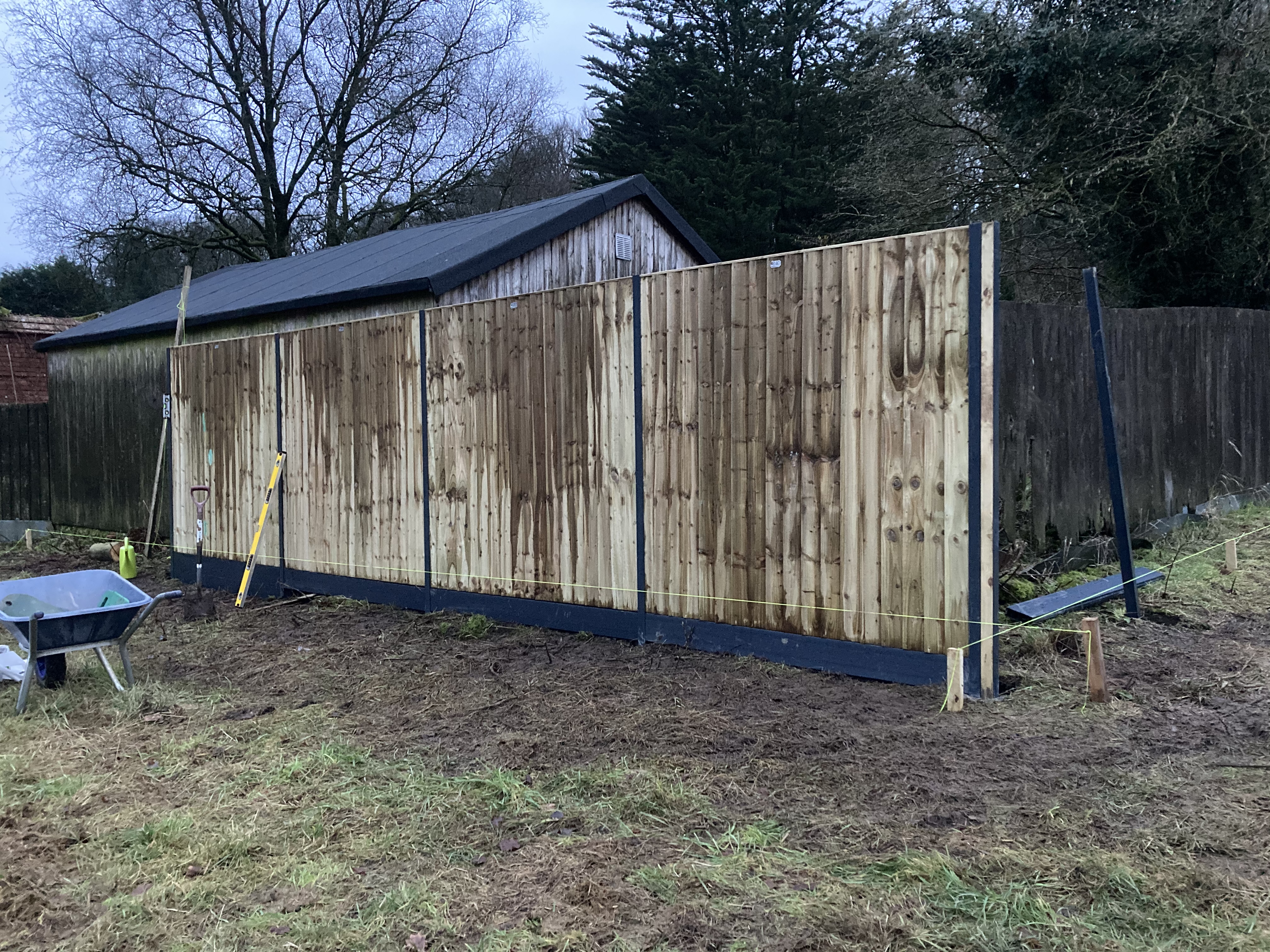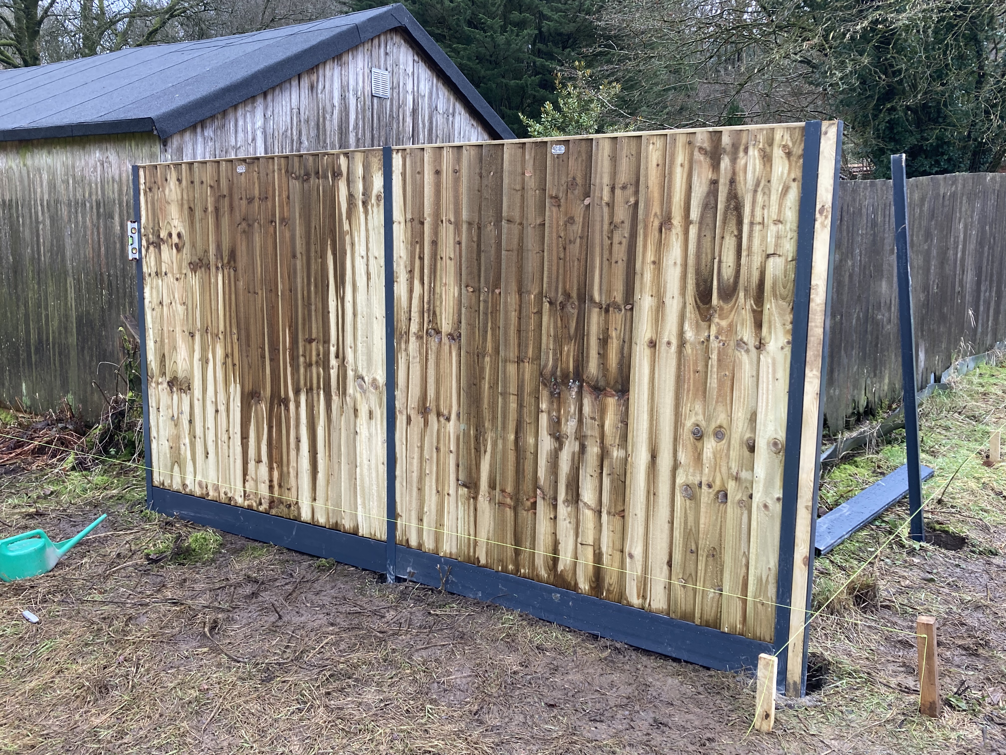 We’re using Durapost metal posts and composite gravel boards so this fencing should last a long time time. We were planning to be purist and do it in individual featherboards, but common sense and these 6ft by 6 ft featherboard panels prevailed ….