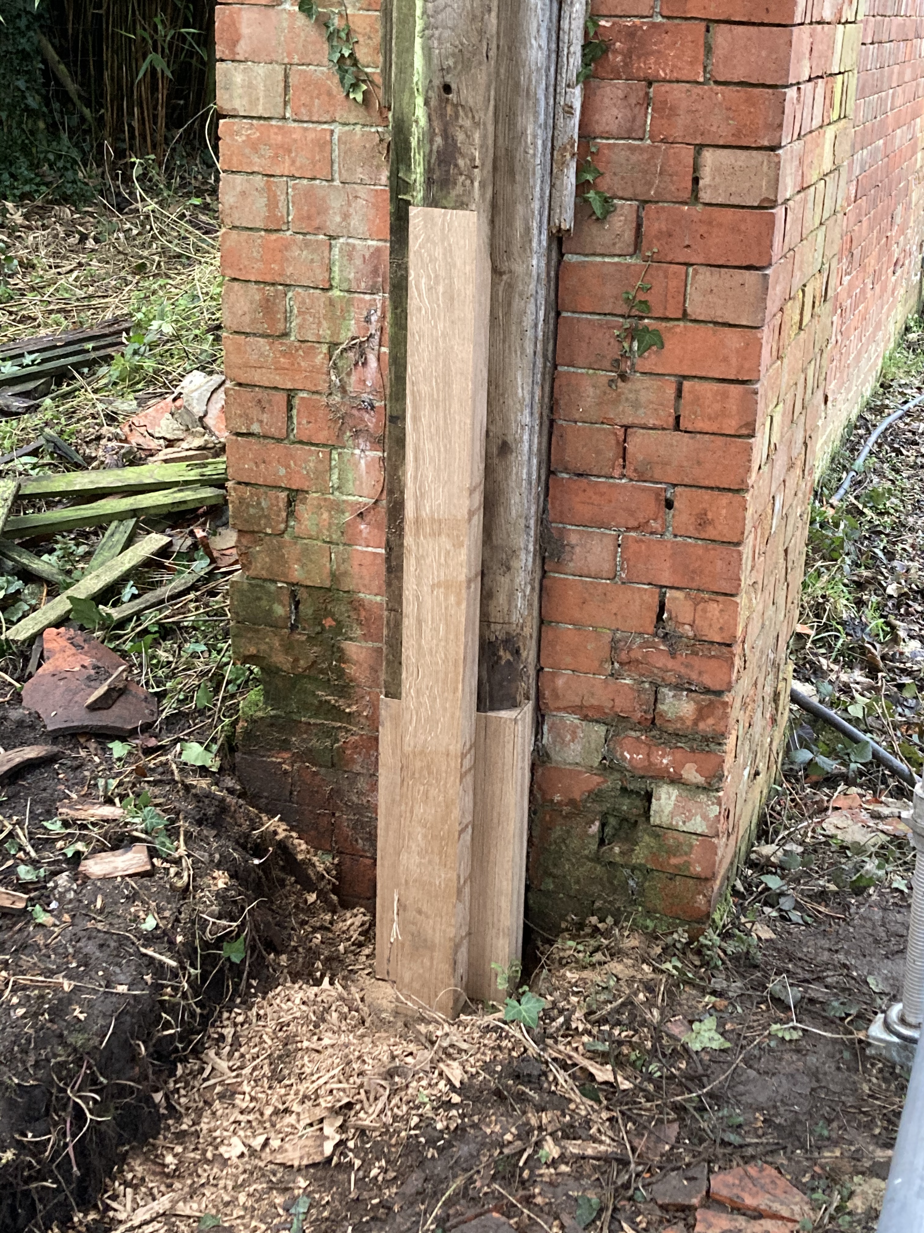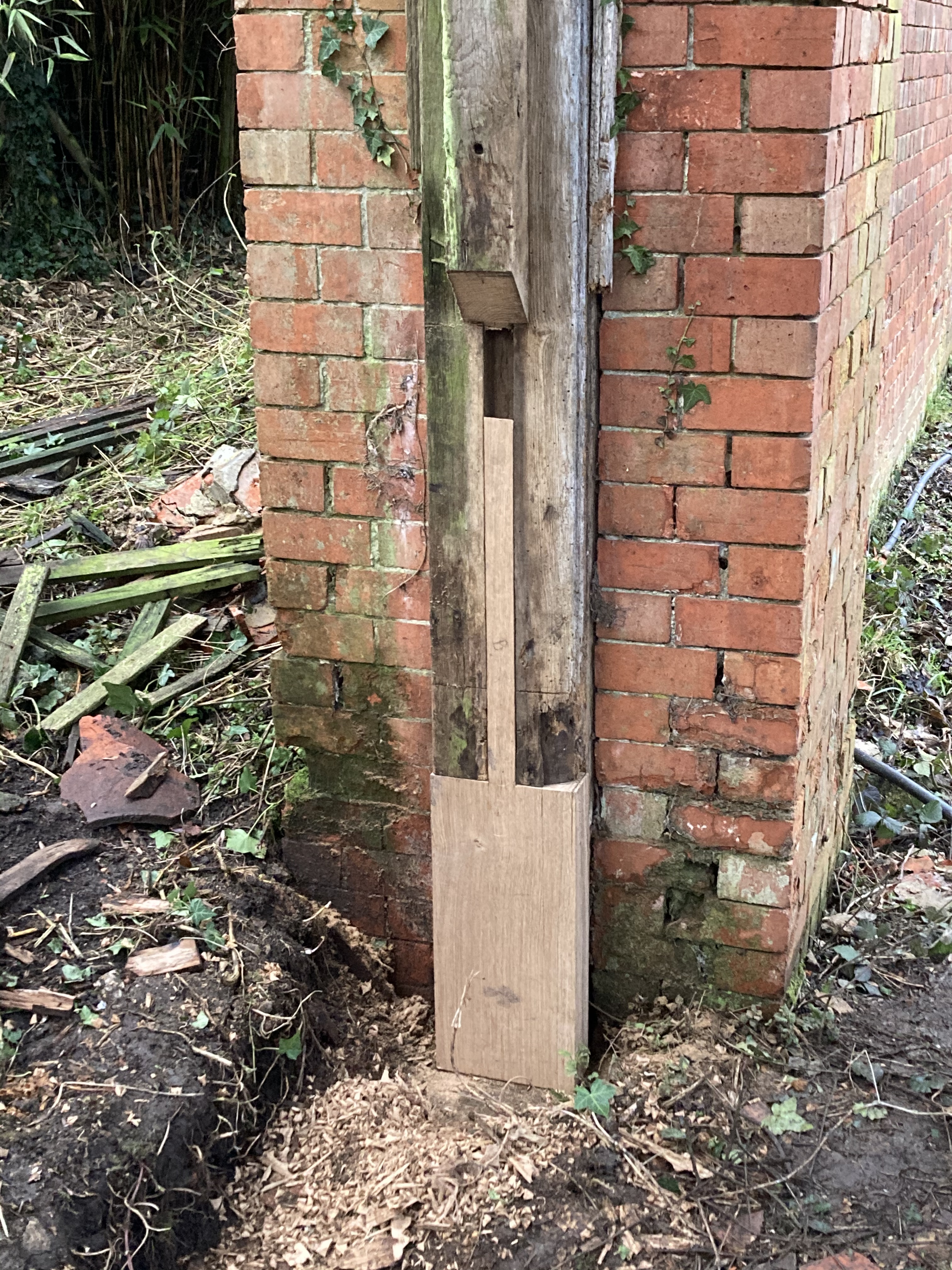 Dave has almost completed his repairs to the west gate posts, straightening them and splicing in new oak where the old has rotted away at the base. A lovely job!