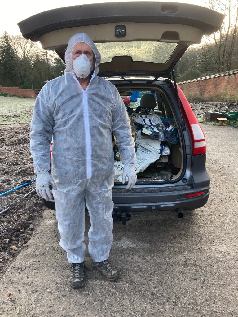 One of Chris’ jobs this morning was to take well-wrapped pieces of asbestos roofing that we’ve found around the site to the Council household waste recycling centre. This had to be pre-booked and delivered before the centre was open. It might be tighter regulation compared to when Chris was a waster or it might be Covid-19, but this is what he had to wear to be let in …. Then afterwards, all his protective clothing had to be disposed of at the centre. But you know how much he loves waste!