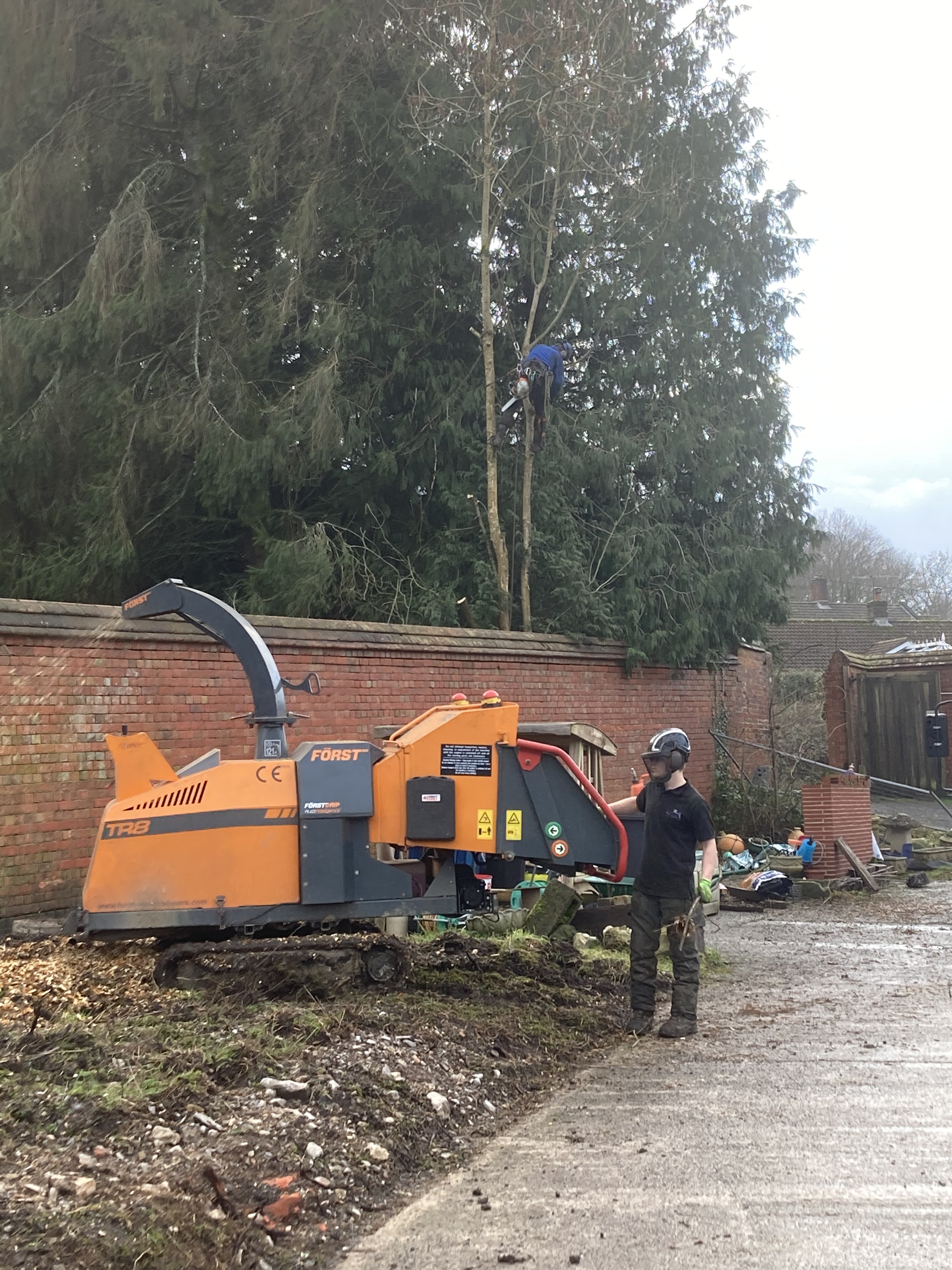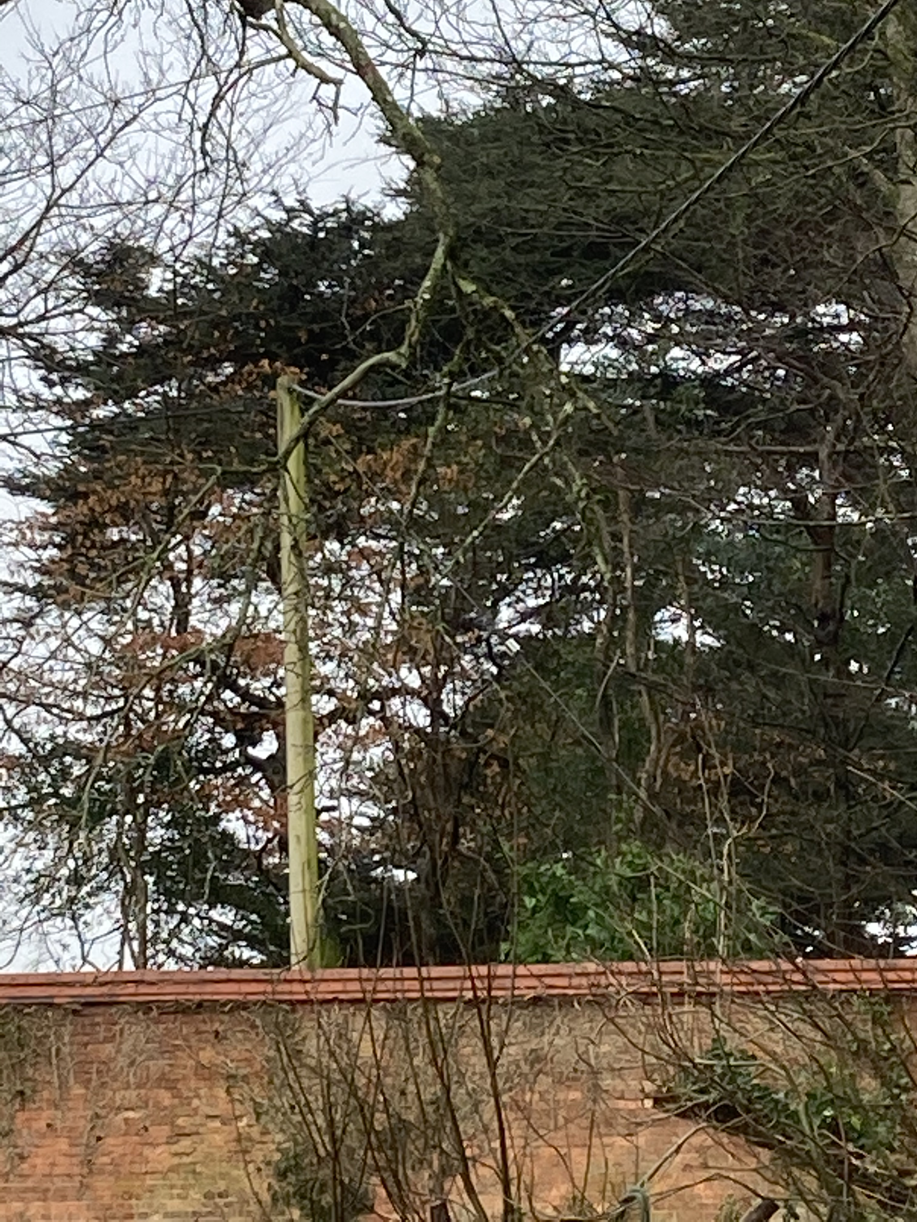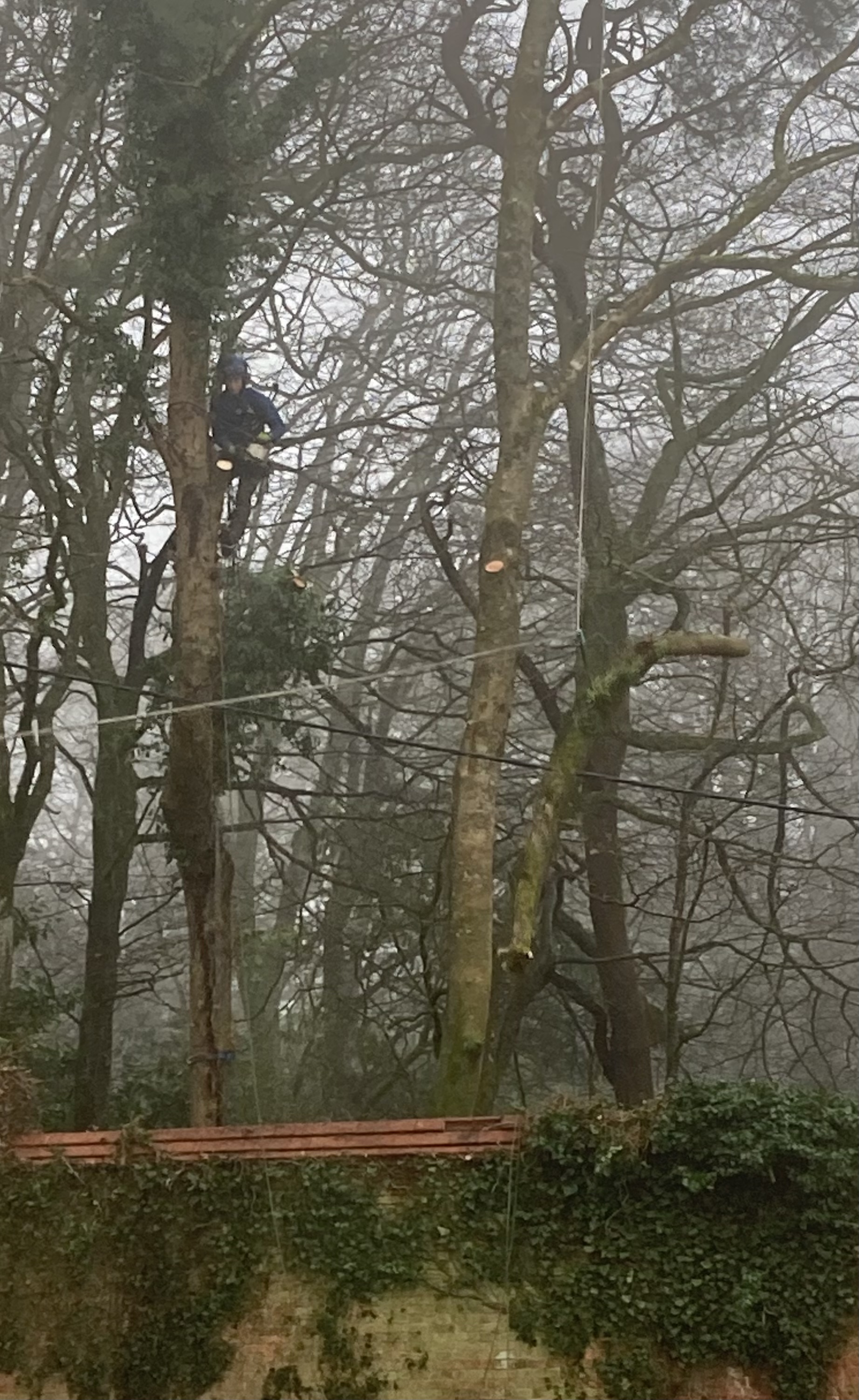 The chaps, who must be keen climbers at weekends, did well to work around the power cables. This involved abseiling some of the branches to the ground which worked well until one got stuck. We want the cables to come down but not like this ….