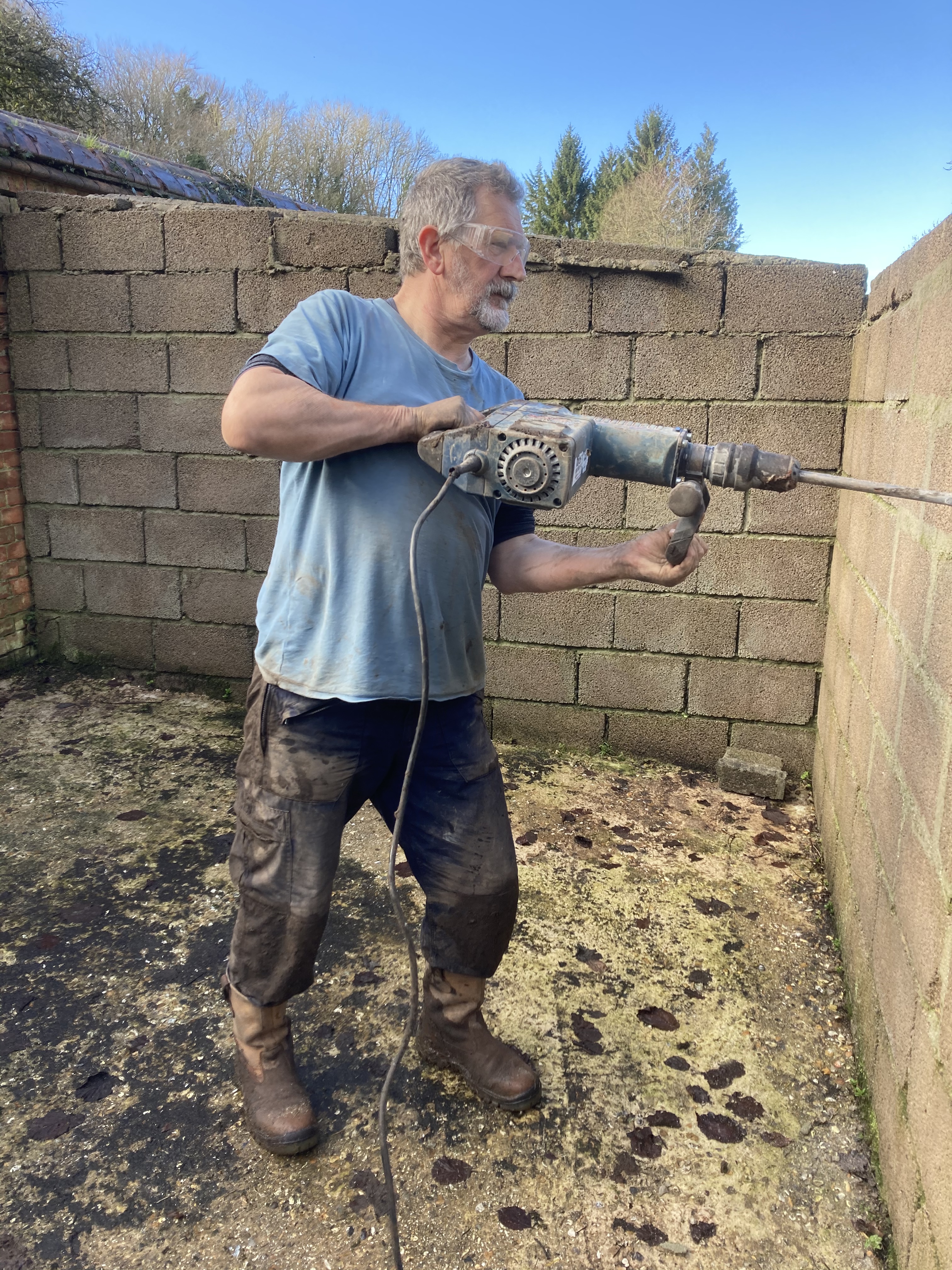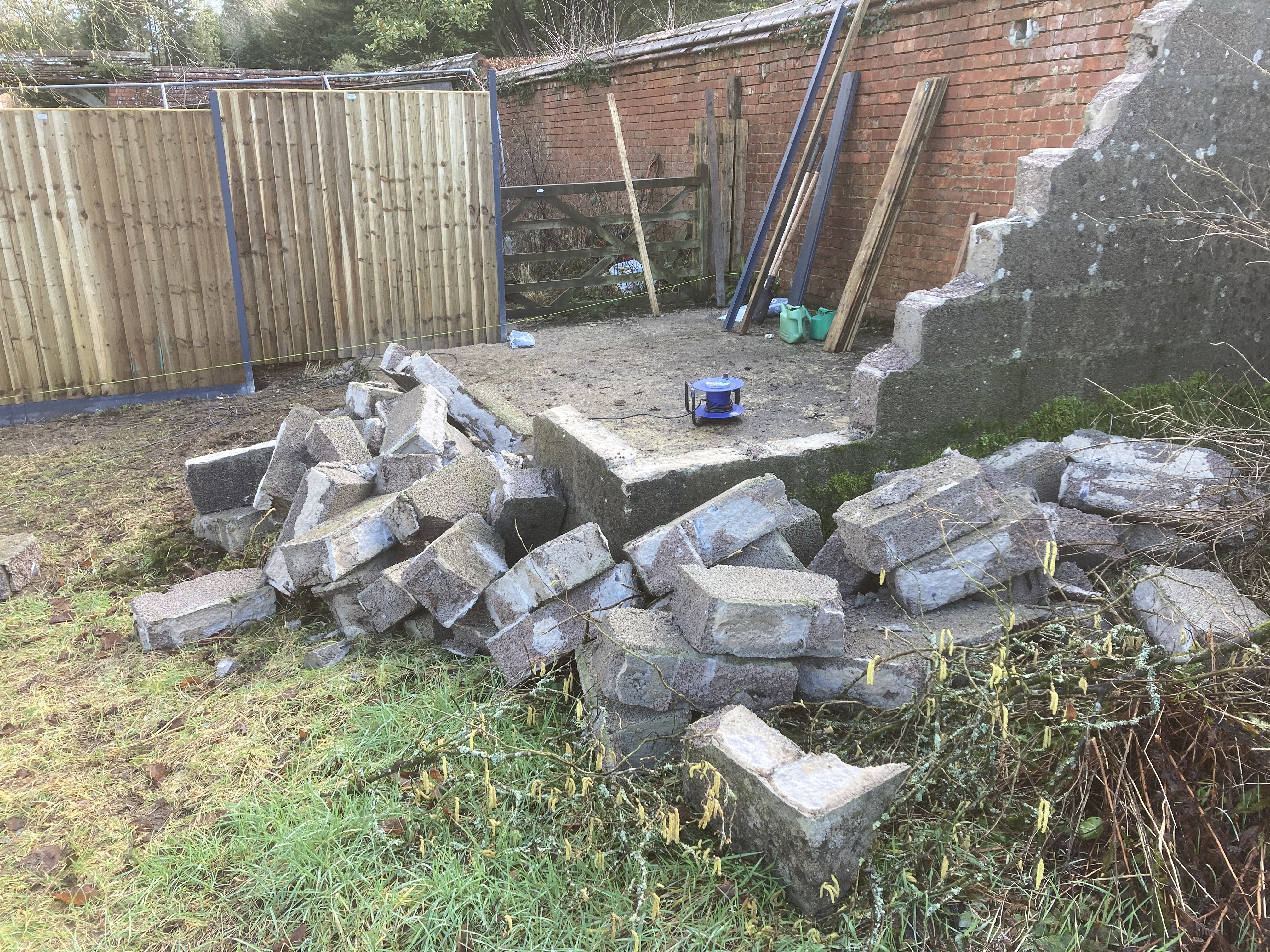 With renewed energy and enthusiasm, and wanting to make the most of the hired breaker over the weekend, Chris carried on to break up the one remaining structure in the garden – a block-built stable for donkeys apparently – which will leave a hard standing that we’ll keep for a new garden shed. All before the rugby starts!