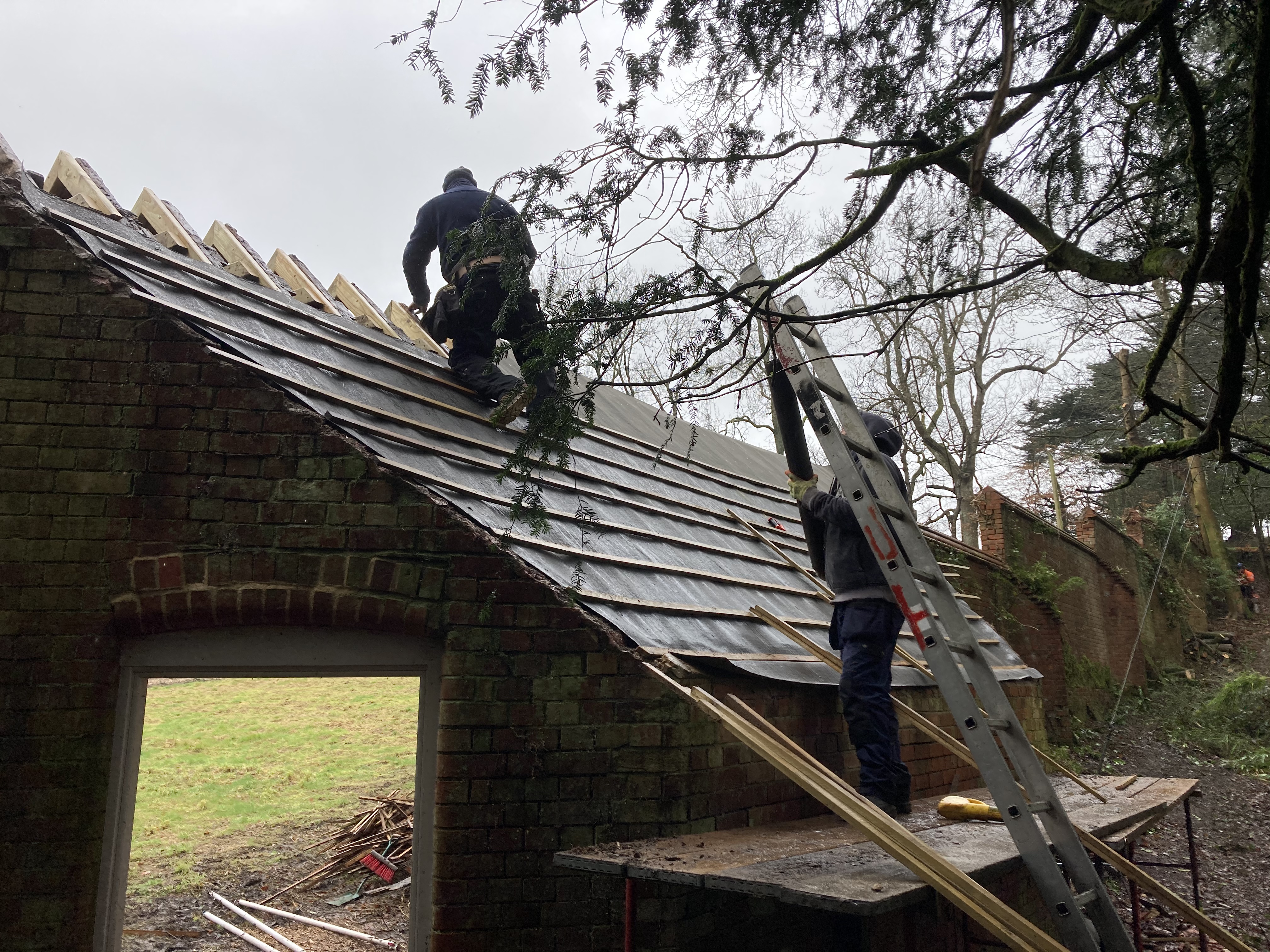 The completion of the well-house renovation is in sight with new rafters, felt and batons, and the surviving clay tiles going back on.