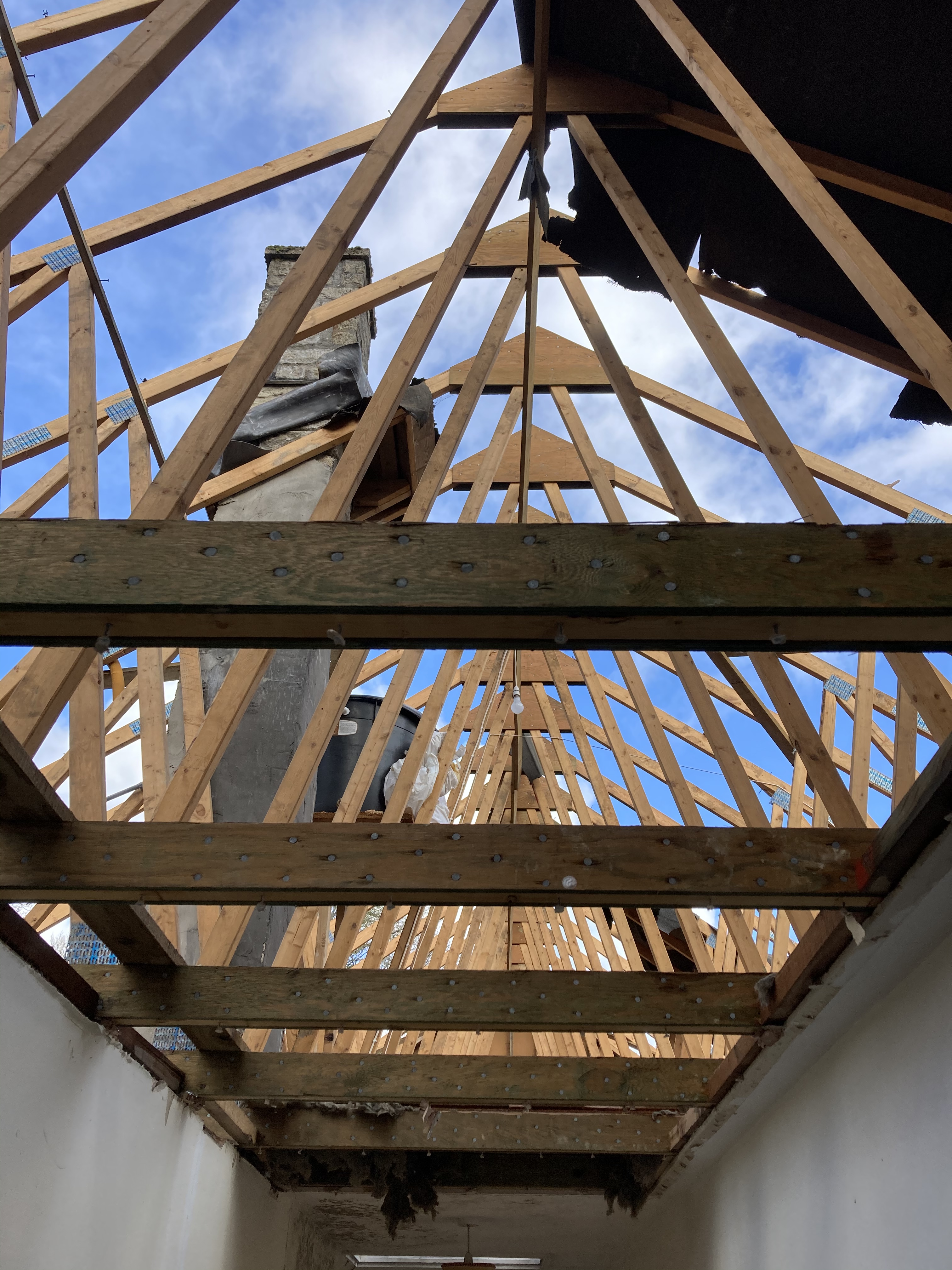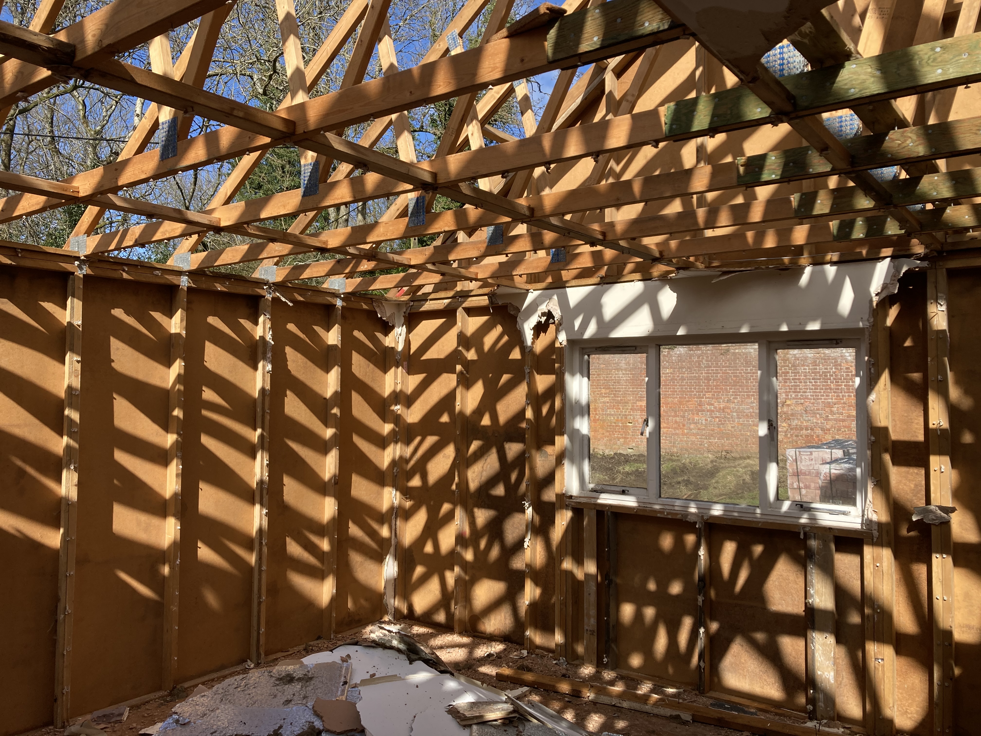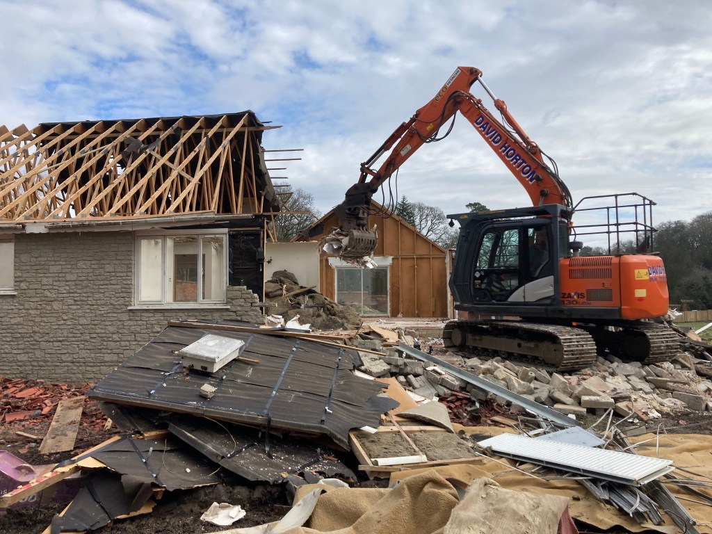 Ben and Levi and a big machine have started pulling the bungalow down – it’ll take two days – carefully extracting and separating wood, metal, plasterboard and the unrecyclable stuff and leaving the rubble to be crushed. It all seems very respectful and sympathetic – no wrecking ball or unnecessary violence.