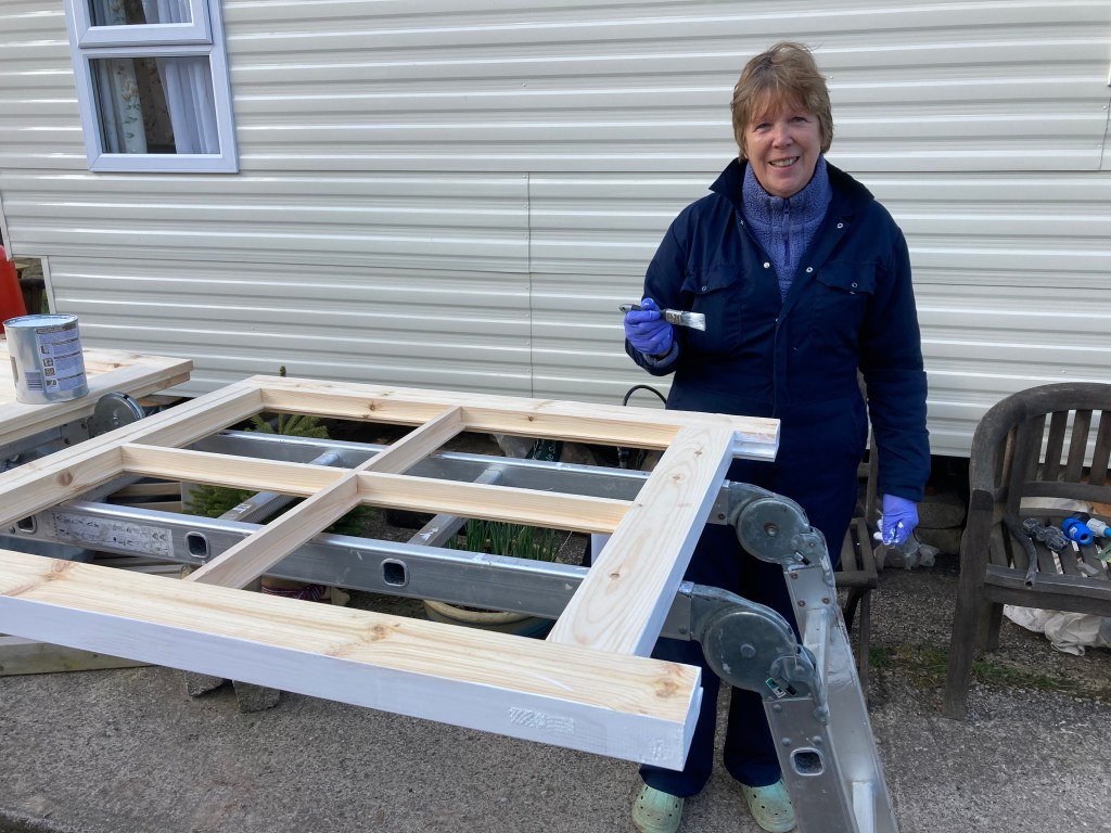 While the big boys and their big toys have been doing the heavy lifting, we’ve done what we can. Bev’s current job is painting the stable door for the bothy.