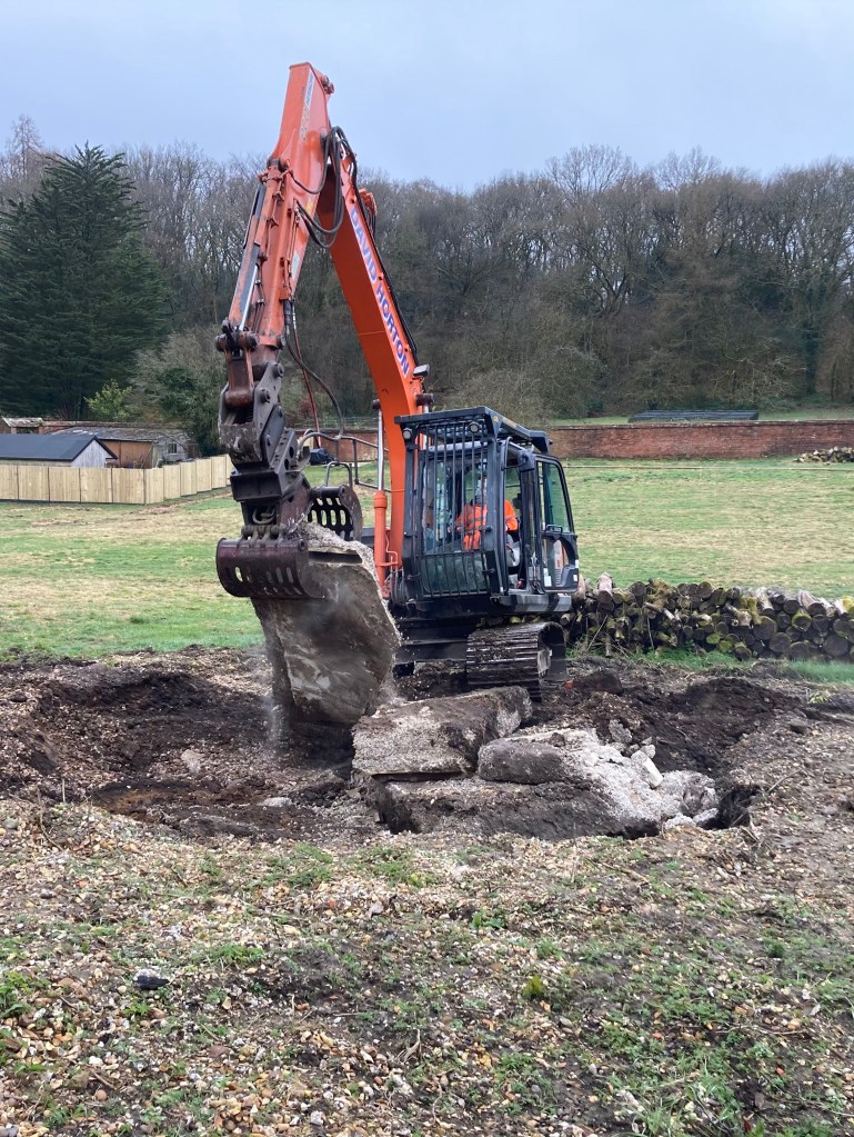 While we had the big machines on site we were able to finally sort out the filter bed (or whatever it was). The unfeasibly thick concrete base is out and the area re-soiled ready to be reseeded.