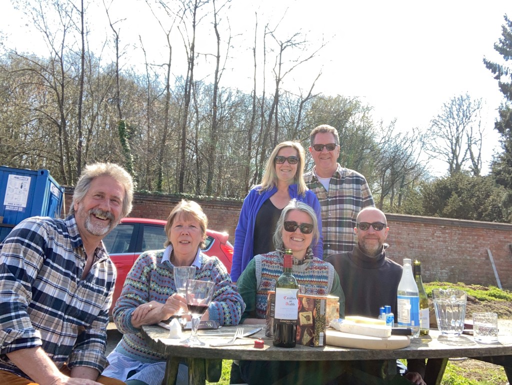 A first gathering of three Mr and Mrs Coxes since before Covid 2019, first visits here for Simon, Jenny and Philippa