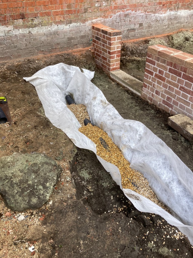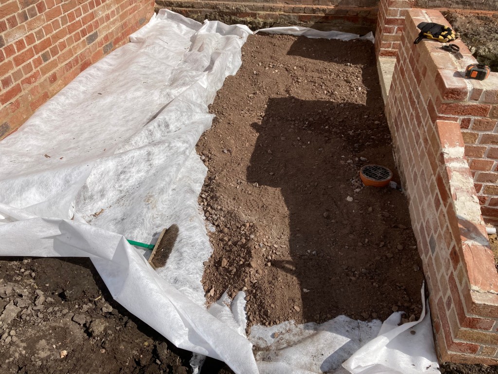 The fresh planning issues will probably delay us two or three months and most likely means another winter in the caravan. But the swathes of bluebells and seeing friends are cheering us up. Fortunately we’ve got about 20 years’ worth of gardening to get stuck into and keep us busy. We’re working on the areas around the well-house and store and greenhouse, putting in drainage and preparing the surface, which will be a compacted sandy gravel like the paths you find in parks and National Trust properties.