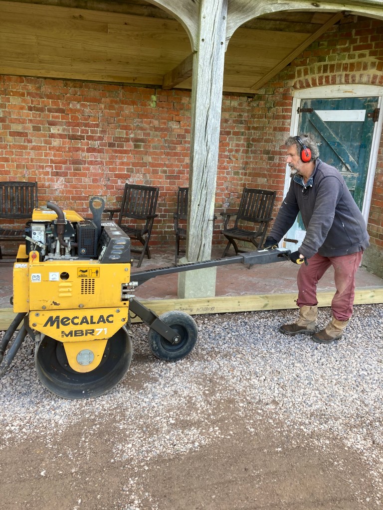 The hired vibrating roller is terrifying and very noisy. It’s a bit like a floorboard sander and you have to keep the drum moving so that it doesn’t dig itself in. Chris’ new ear protectors are essential and surprisingly fetching, and could be equally useful for the “which job are you actually going to finish before starting another?” discussions …