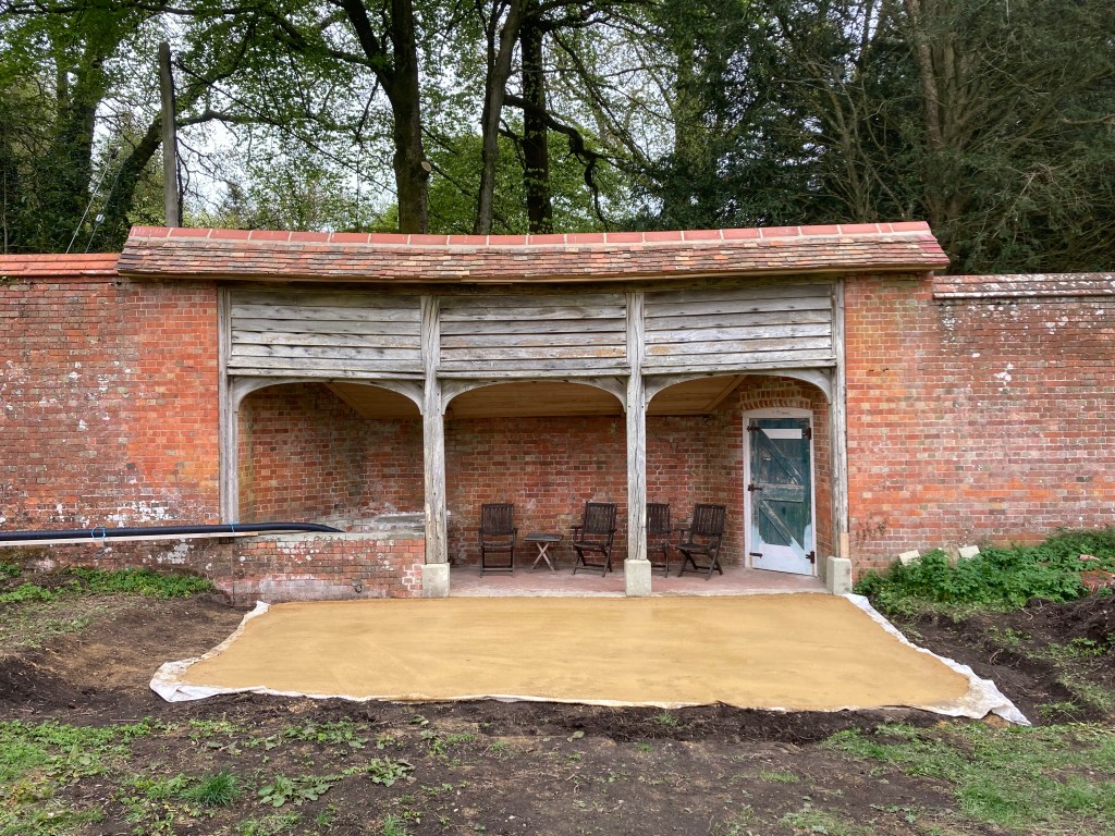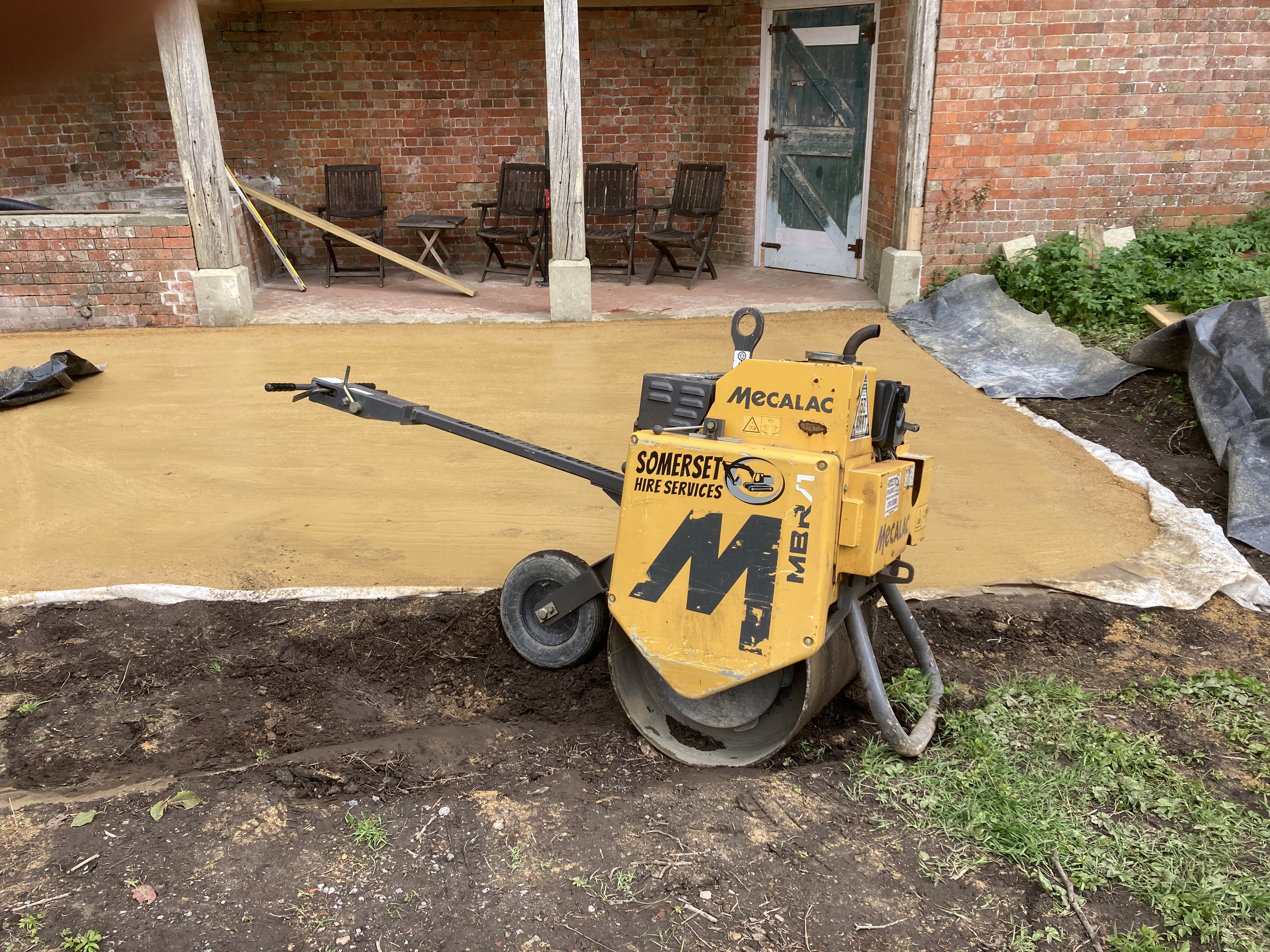 Putting the self-binding gravel down on the apron went okay today except for a hamstring injury for Chris and a problem at the end when the roller nearly rolled (in the wrong way) on its way out. The ‘site tractor’ – the ever-reliable and abused Honda – pulled it out. We’re wondering if the heavy rain tonight is washing away all the fine bits in the gravel.