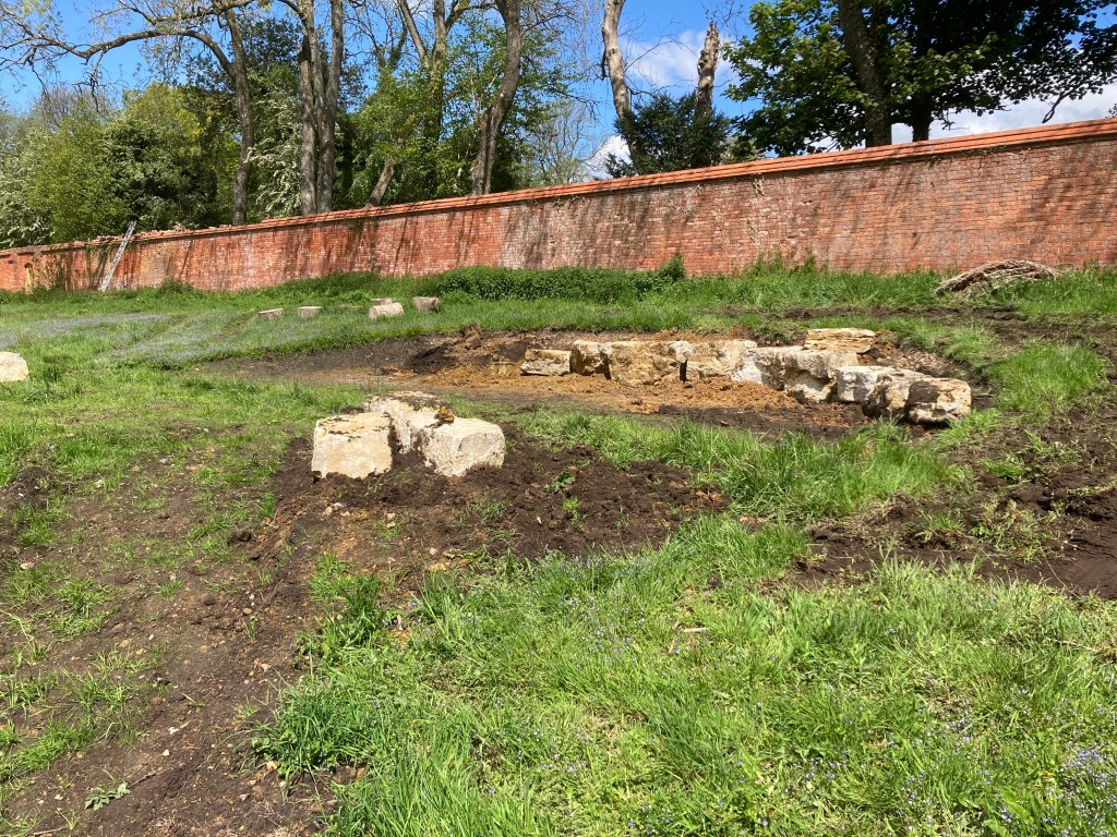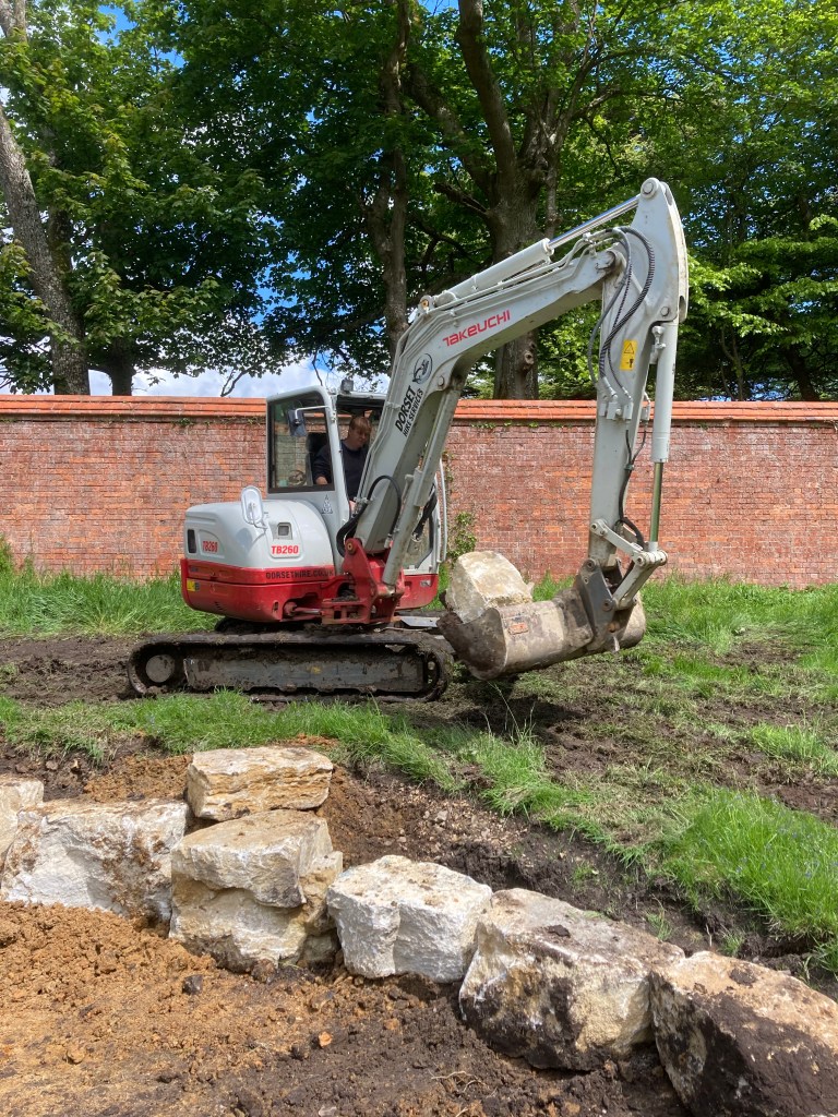 Job 2: placing blocks of Purbeck stone on the picnic and fire pit area to form a circle and some seating, satisfactorily tested out by Bev