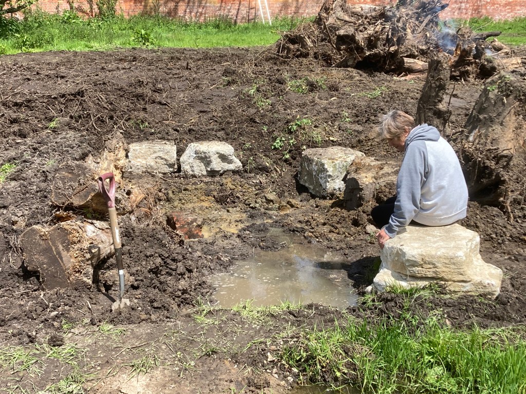 Job 4: digging a bog garden. On one slope there’s been a very boggy area where water draining off Barn Hill hits the surface. There wasn’t much we could do with it so we’ve shaped an area for the water to collect and incorporated some of the tree stumps and rocks