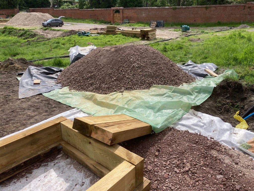 Chris had a rather boozy weekend with the classic car Jolly Boys and the ‘payback’ will be shifting another eight tonnes of aggregate to form the paths around the raised beds. But we did manage to persuade the driver to tip it a lot closer to where we need it.