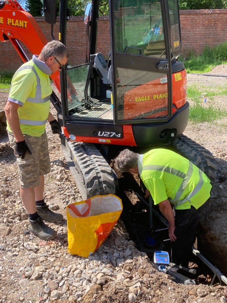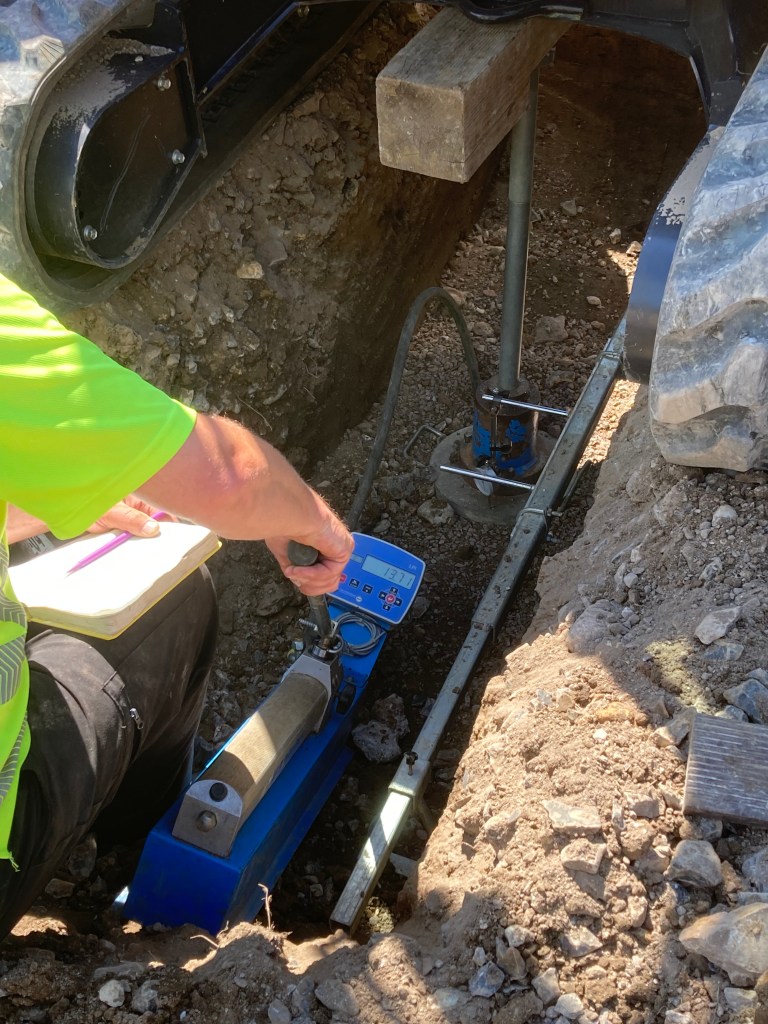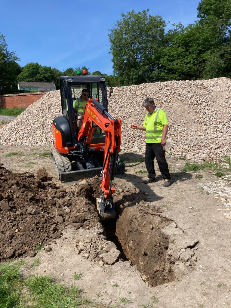 Today Paul and Jason spent the day digging four trial pits, logging the nature of the underlying soils and taking samples for laboratory analysis, and undertaking four CBR (California Bearing Ratio) tests that measure the strength of the underlying ground. The CBR test involves the use of some clever kit and a hydraulic jack between a plate on the soil and the weight of the digger. Fingers crossed for the results!