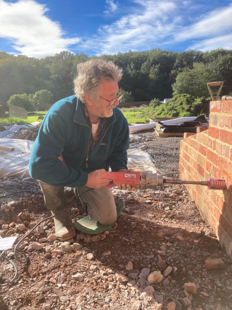 Drilling holes for rainwater collection in the greenhouse wall ready for the installation in a couple of weeks – we’ve been very patient!