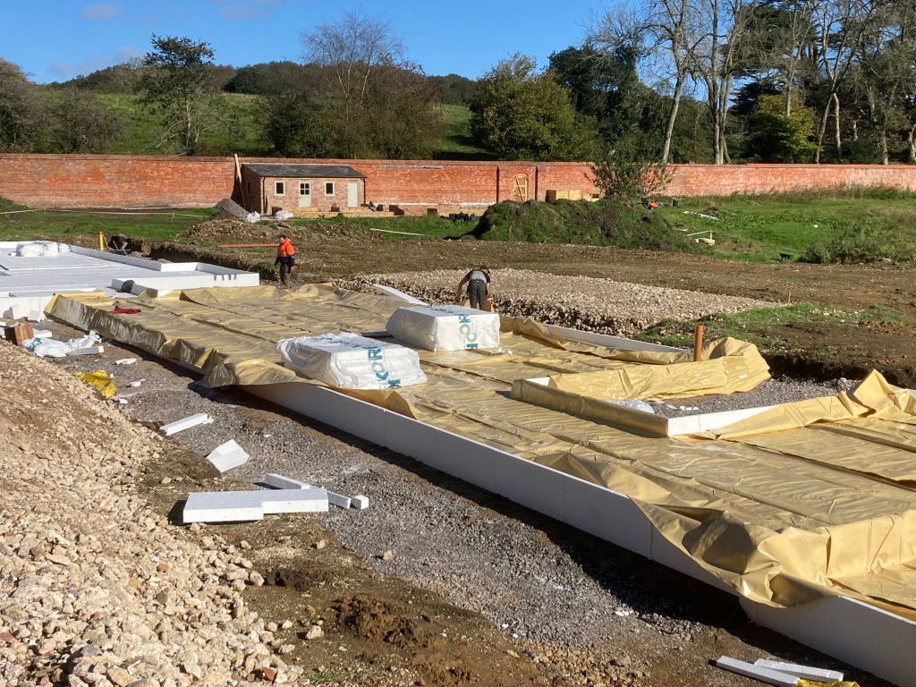 The combined radon barrier and damp proof course goes in above the polystyrene insulation: