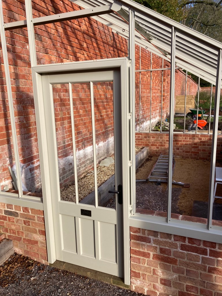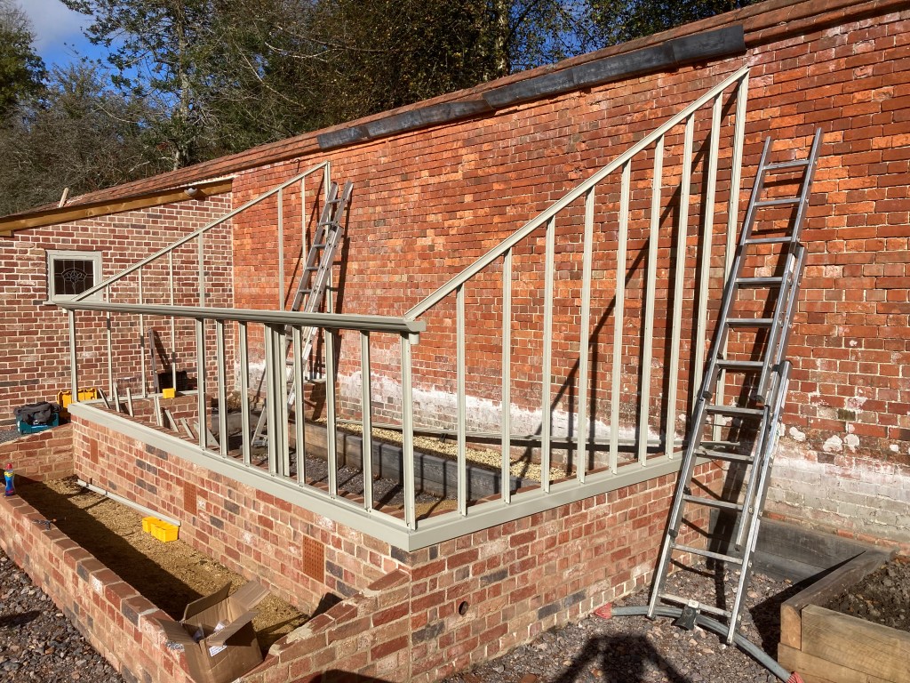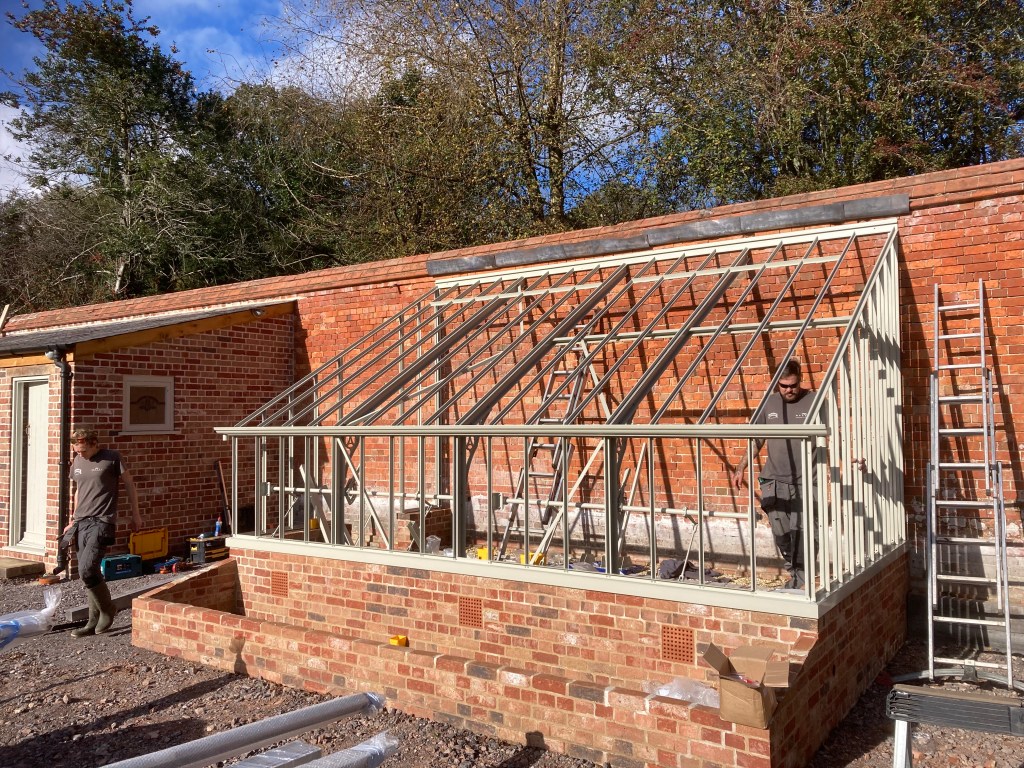 With all the focus on the house foundations, we’d rather overlooked that at long last the greenhouse is going up this week. In contrast to Fergal and the Donegal team, Ben and Shaun will be travelling daily from Hampshire and keeping to normal working hours. The first elements go up so quickly we were wondering how it was going to take three or four days. But the fiddly bits like the lead flashing and glazing will apparently take the time.