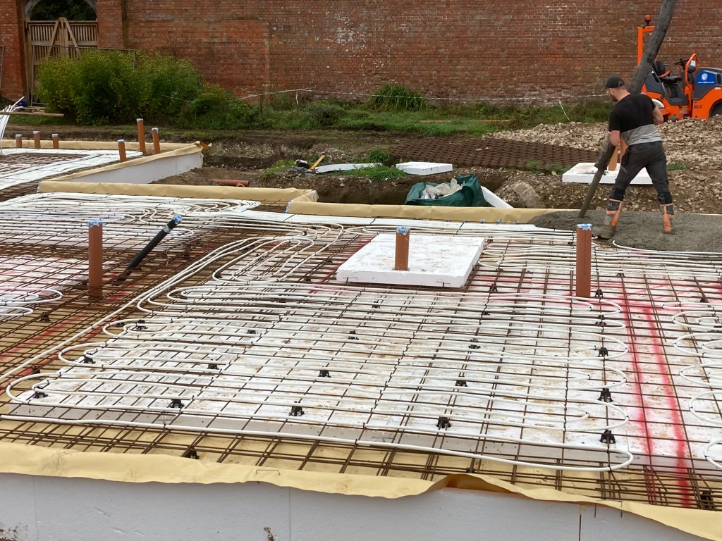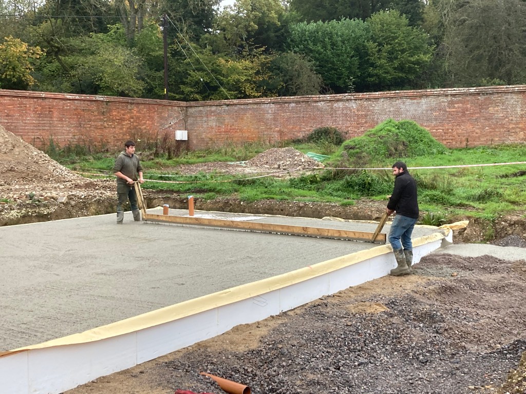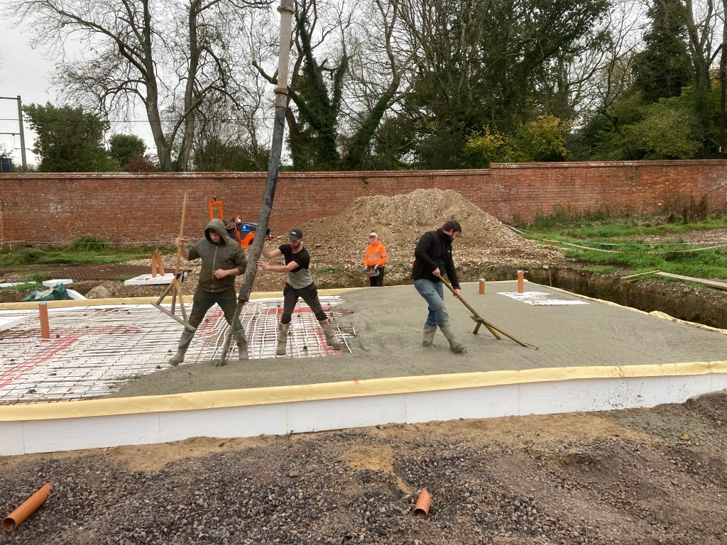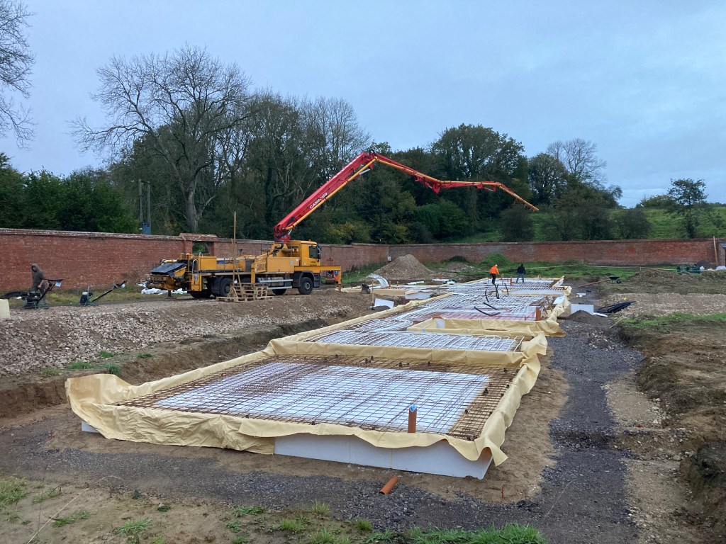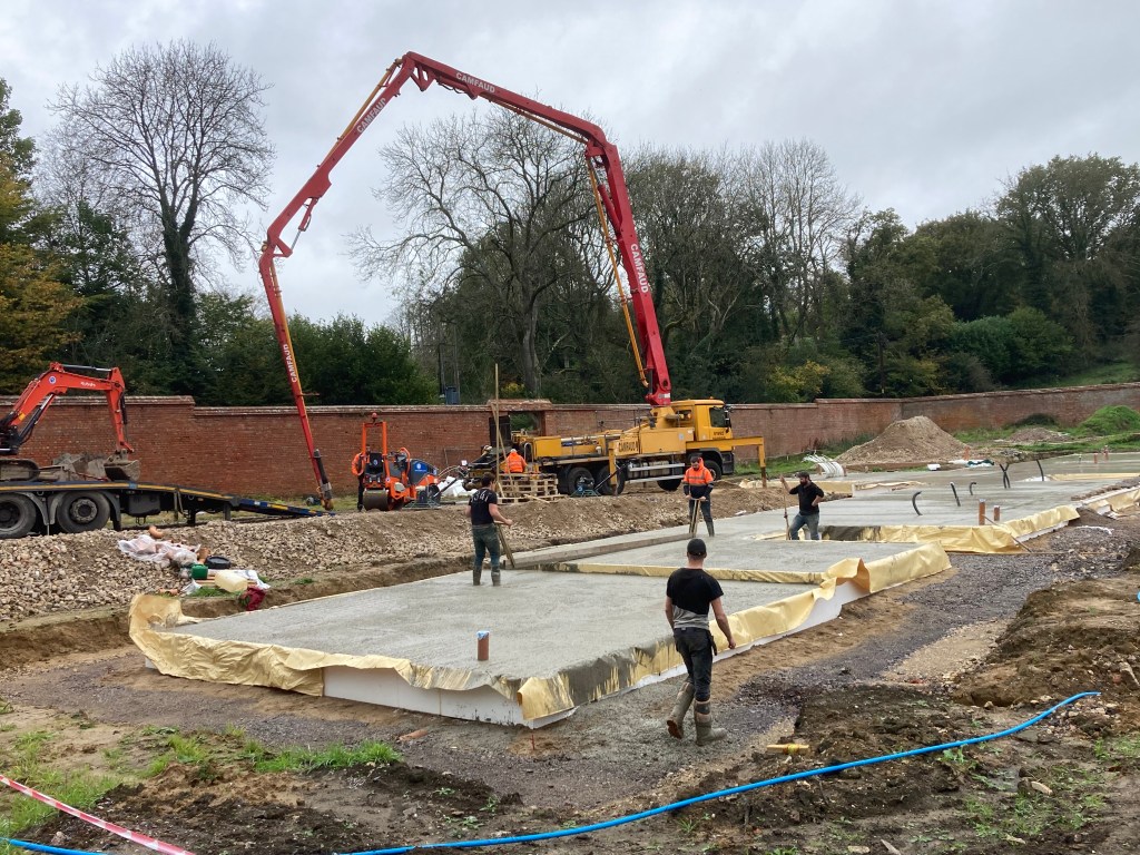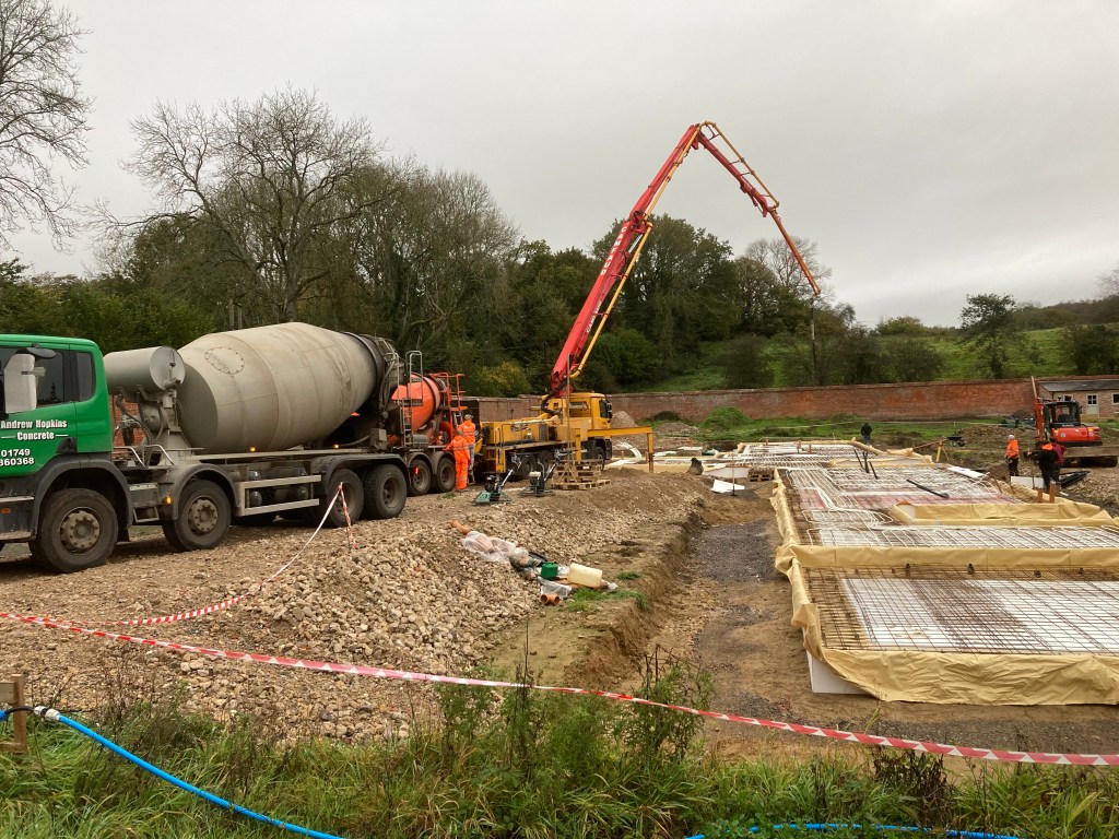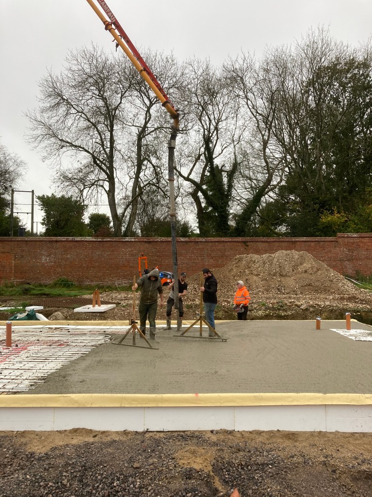 The day started early with the arrival of the concrete pump, chewing up the neighbours’ bank as it manoeuvred in. It was in position with a full reach across the site before a steady stream of ready-mix lorries trundled in – ten in all over the morning, carrying about 80 cubic metres of concrete.