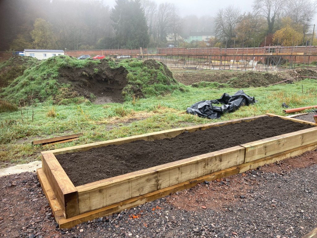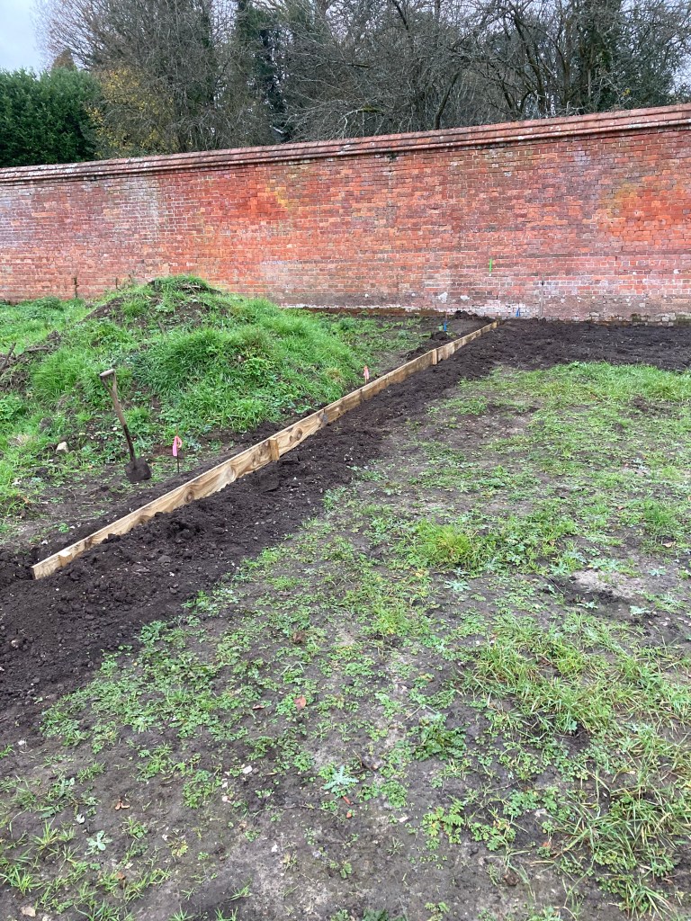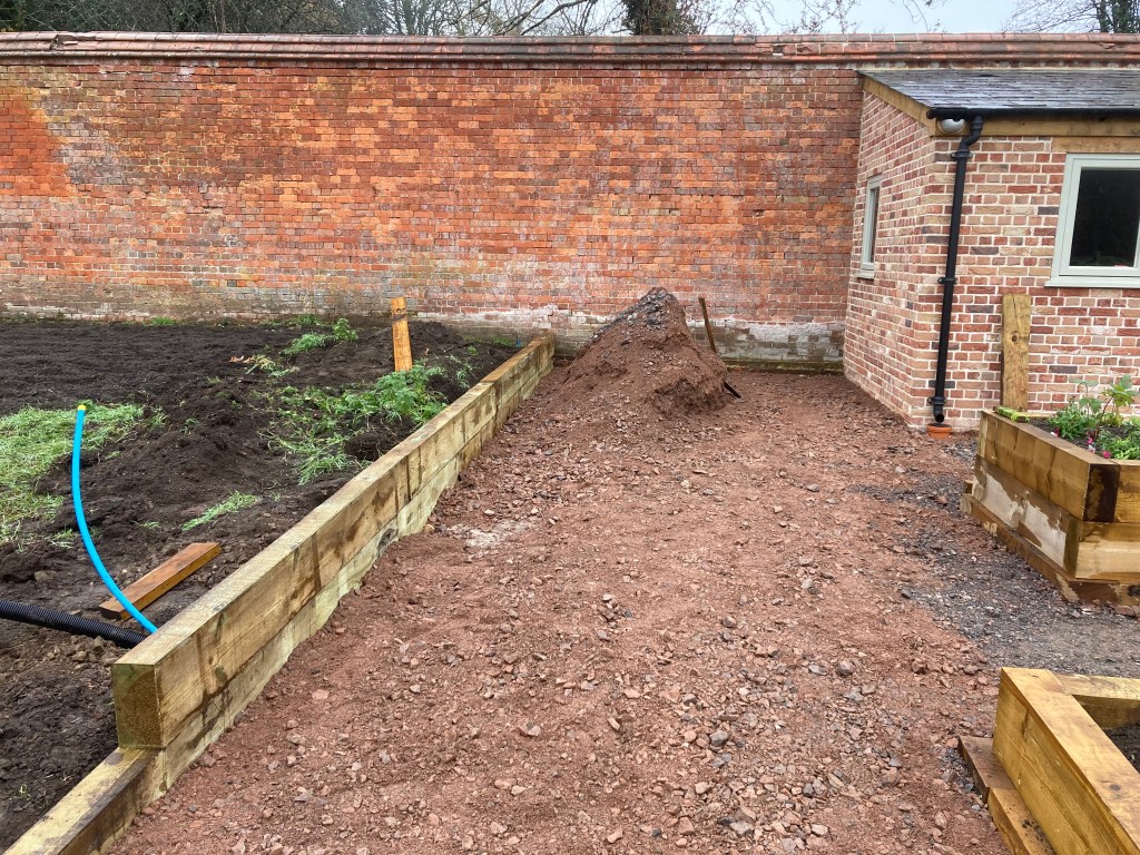 We’ve done more on the veg area and what will be the ’white garden’ near the potting shed, putting in wooden shuttering to hold back the couch grass, spreading type 1, and recovering earlier stockpiled soil. The soil drains quite well so rain doesn’t keep us off it for too long.