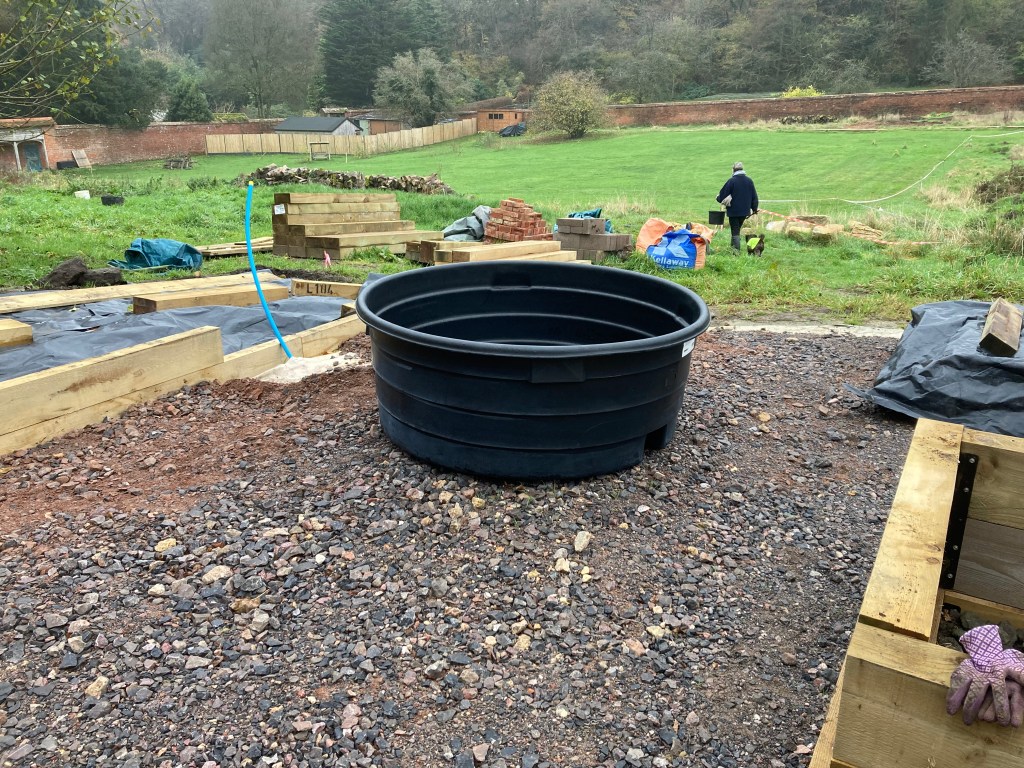 We like to grab ideas from any gardens we visit, and for some time Chris has fancied a ’dipping pond’ by the raised beds for filling watering cans and buckets. He’s bought an ugly but robust plastic trough which will be fed with harvested rainwater and, to improve its looks, surrounded by a ring of corten steel.
