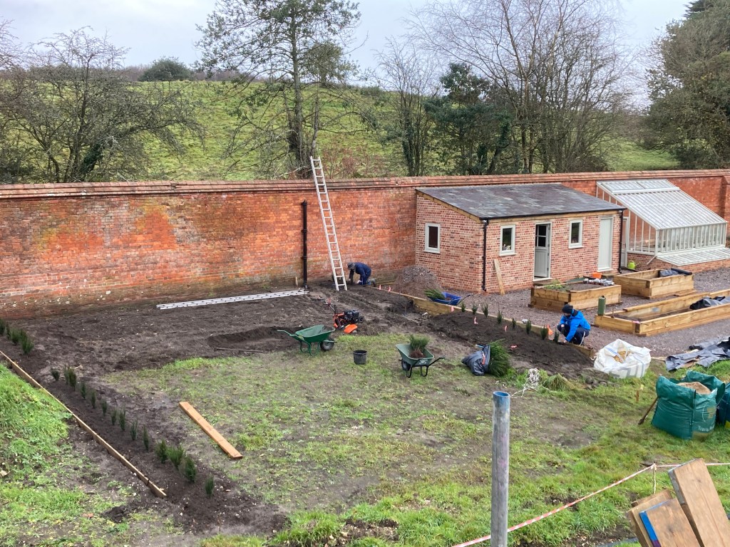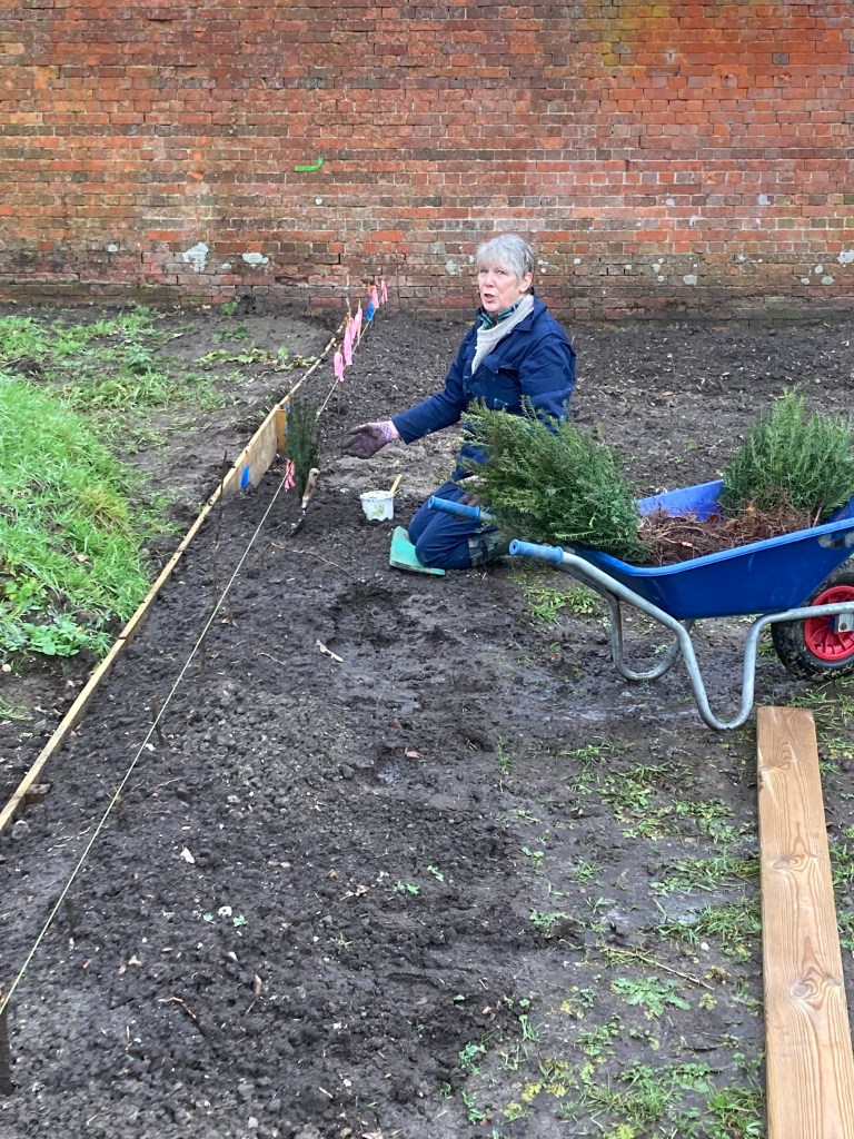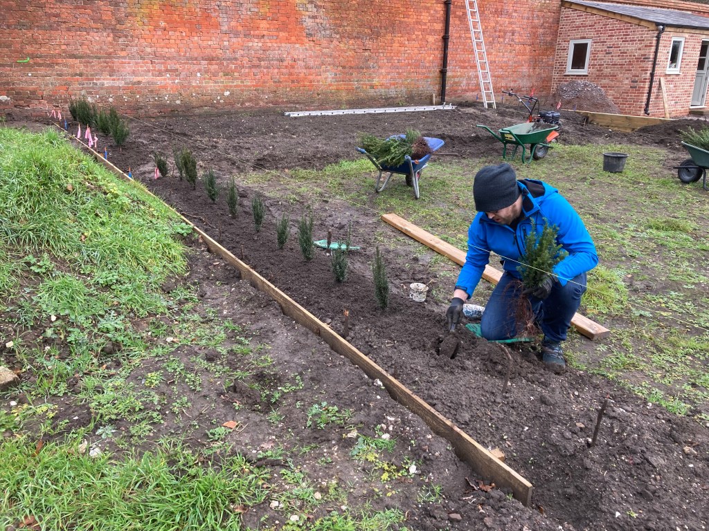 Poor old Gen has been in bed with a cold today, but Ollie kindly came over to help plant the first yew hedges that will enclose Bev’s white garden.