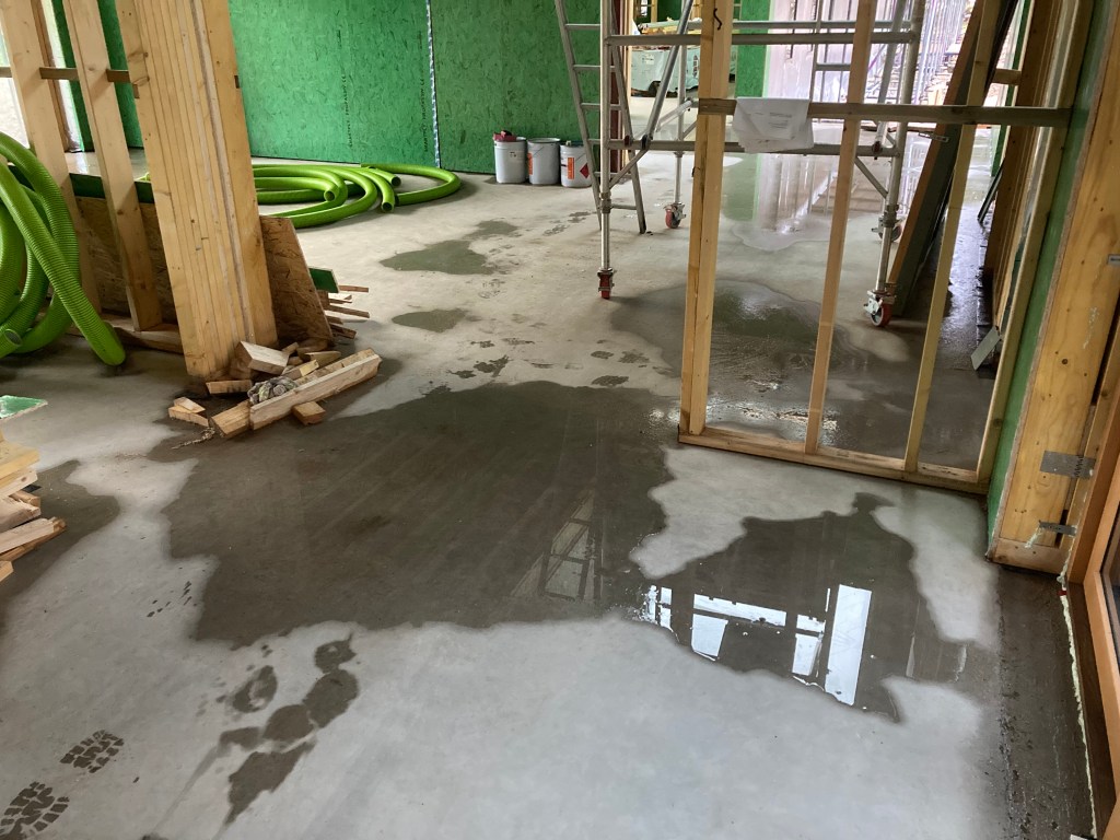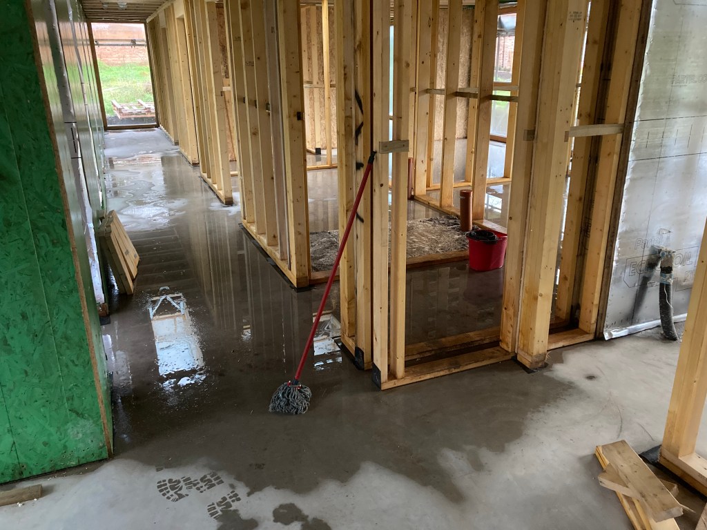 We keep ourselves busy with planning the next stages – flooring, electrics and plumbing first-fix, dry-lining and plastering, doors, and the dreaded technology (lighting controls, audio-visual, wifi etc) – and choosing and buying stuff (we’re onto bathroom fittings). We’re beyond the Kevin McLeod “hmm, how’s the budget?” stage as cash floods out … Chris mops up inside but the satisfaction of no standing water is short-lived – the puddles are getting smaller though!