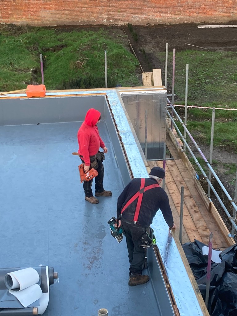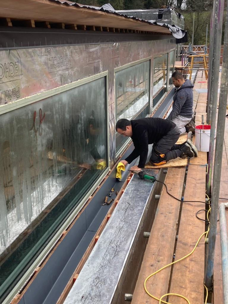 Our tradesmen have been plugging away on the roof, Jose and co on the PVC membrane to the flat parts of the roof and gutters, and Dave and Curtis on the plywood ahead of the membrane and zinc. Interruptions are from the rain and now sleet. Next week is looking dry so we might be largely weather-tight in 10 days. Fingers crossed. The start of the zinc, which will be laid by a different team, is still a couple of weeks away.