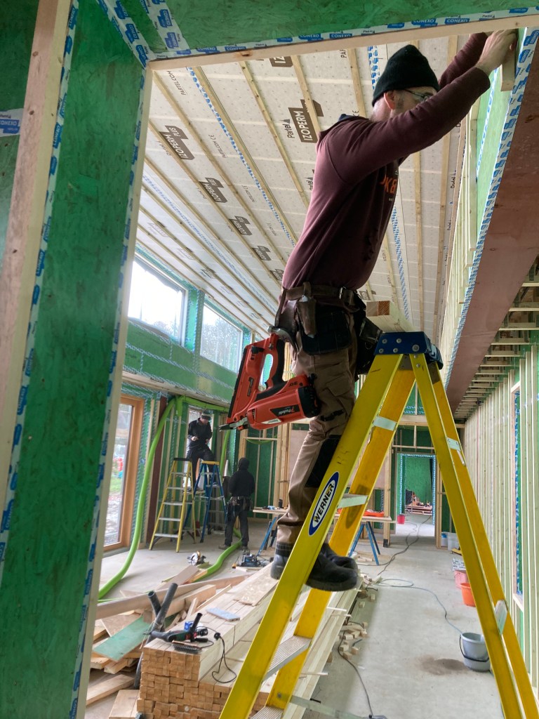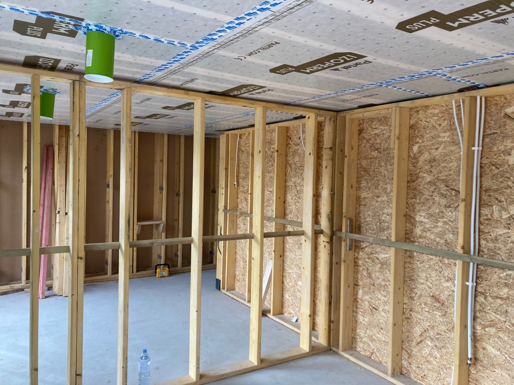 The MBC guys have been back to batten out more of the rooms and install the airtight membrane and tape. They’ve been fitting us in between jobs with a day here and there, but still blow us away with their productivity. This is giving us more of the feel of the house and we’re progressing with laying out electrics and even thinking about where furniture could and couldn’t sit.
