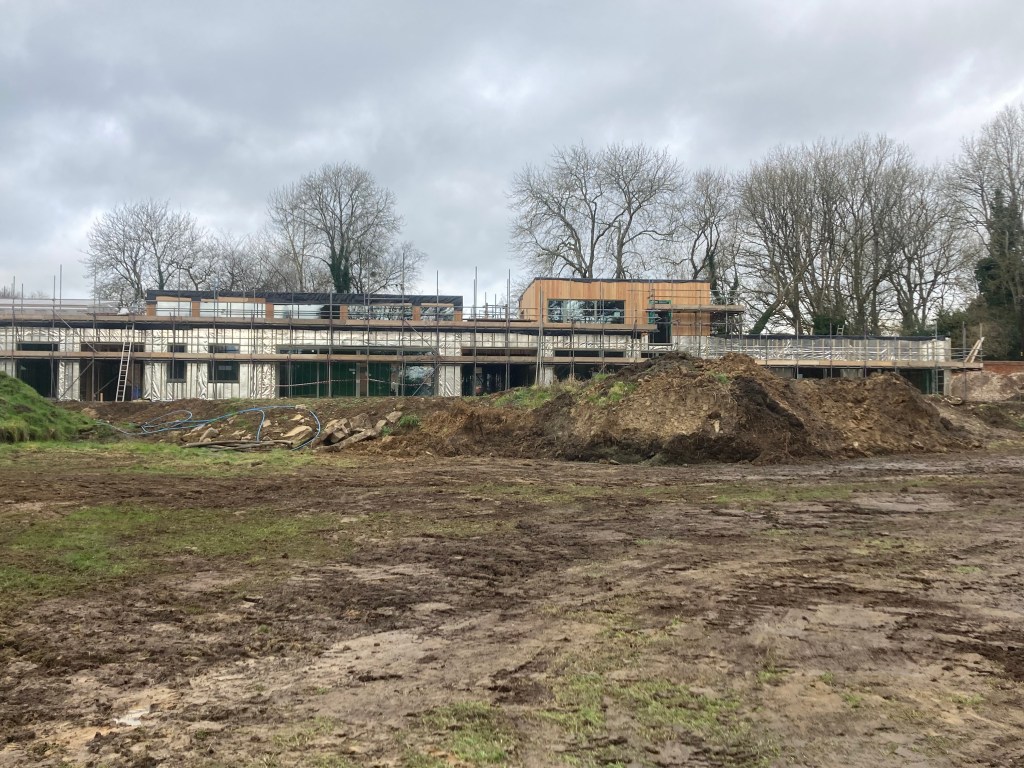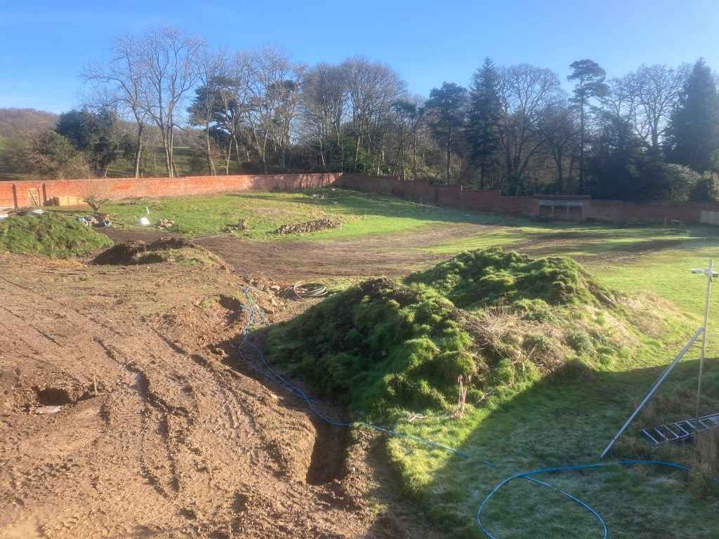 Page and Gavin have worked hard to reinvigorate the grass around the trenching and we’re hopeful the areas to be reseeded can be limited to the three long scars of the trenches themselves. With the recent rain, the whole area is very boggy and there’s water sitting in every depression. The outlook of unseasonally warm weather could be good for recovery of the grass – old and new.