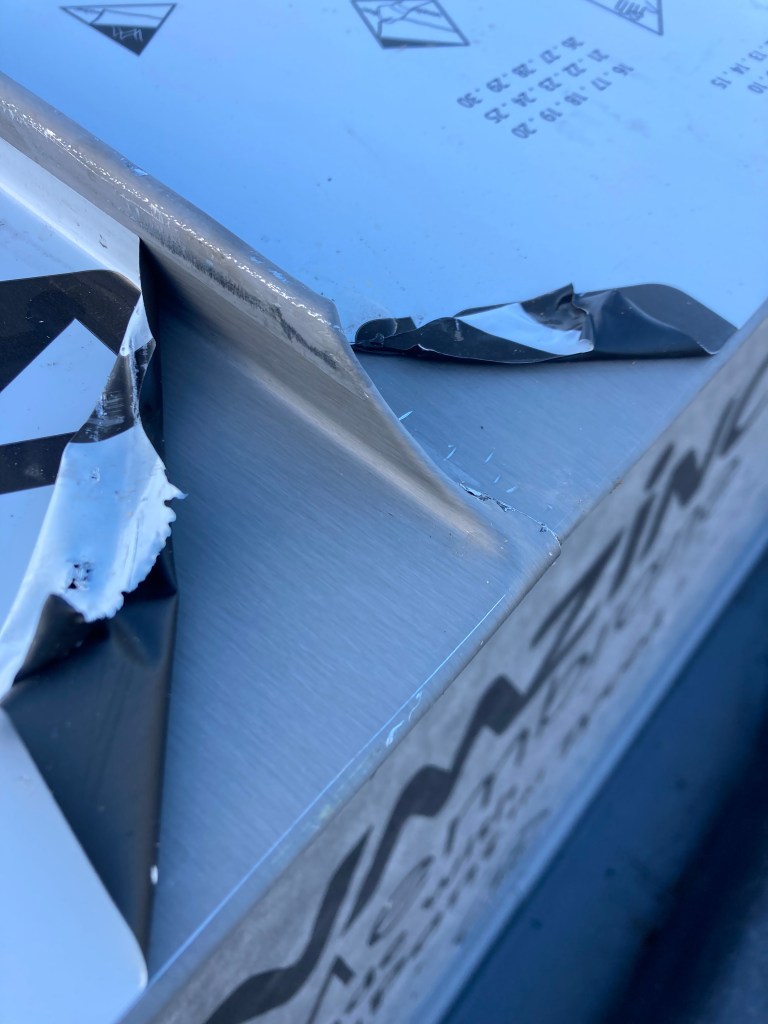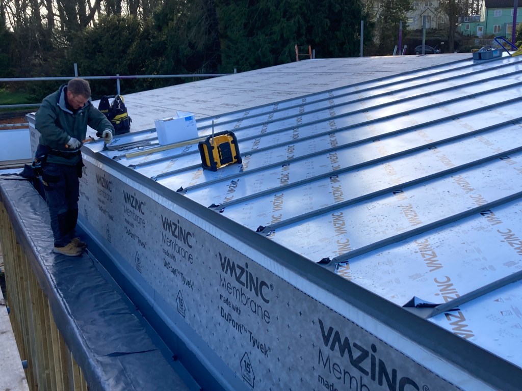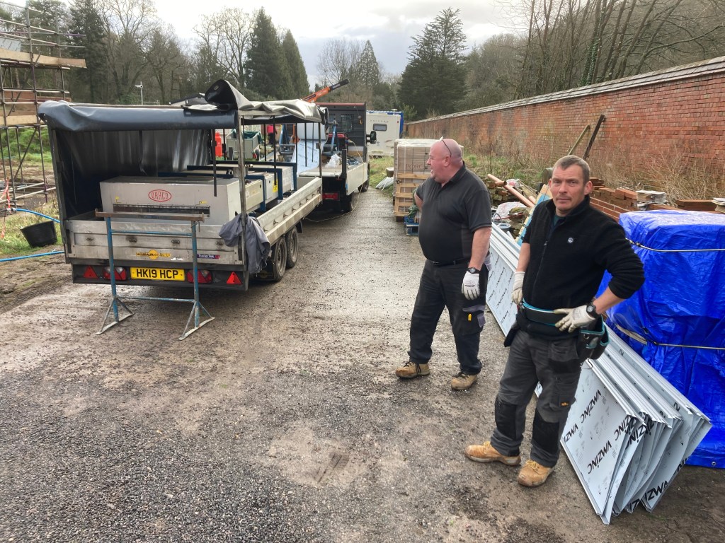 We arrived back too late to see Andy and Tony pressing the zinc roof trays on the lorry-mounted machine. The first roof is now finished.