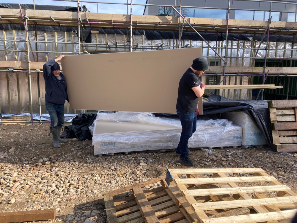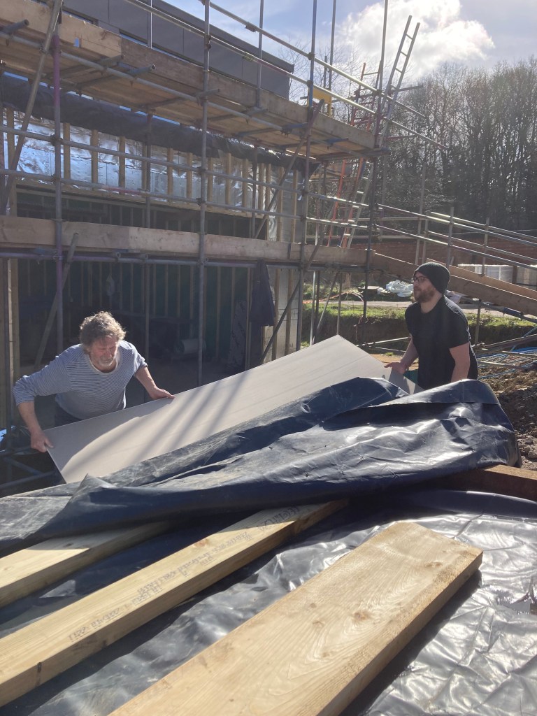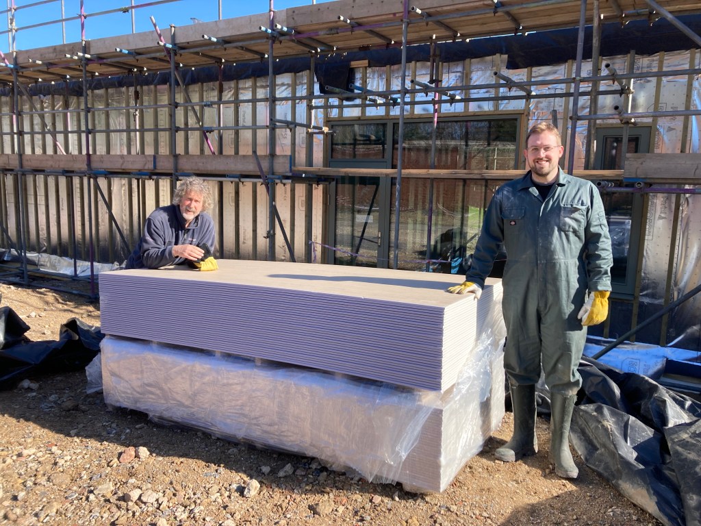 Ollie came on Saturday, and Henry on Sunday to help move 250 sheets of plasterboard inside – over 7 tonnes we think! Thank you, boys! And I (Bev) helped with the last 24!