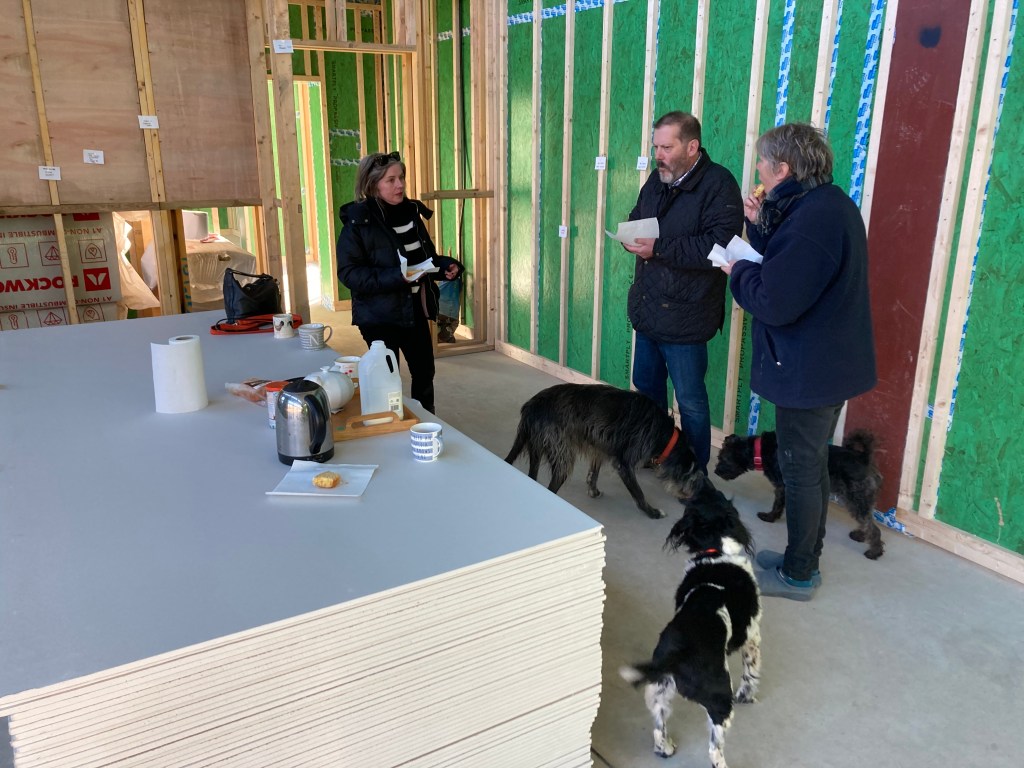 The pile of 3metre boards made a perfect tea table when Russ and Sue popped in with Billy and Sootie.