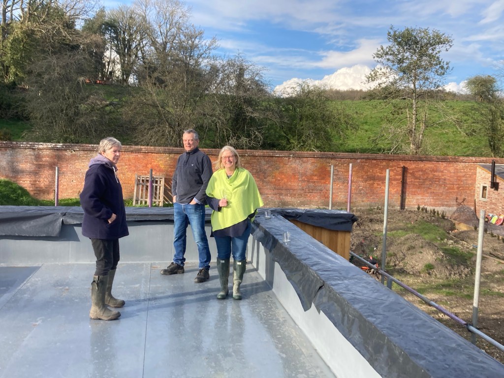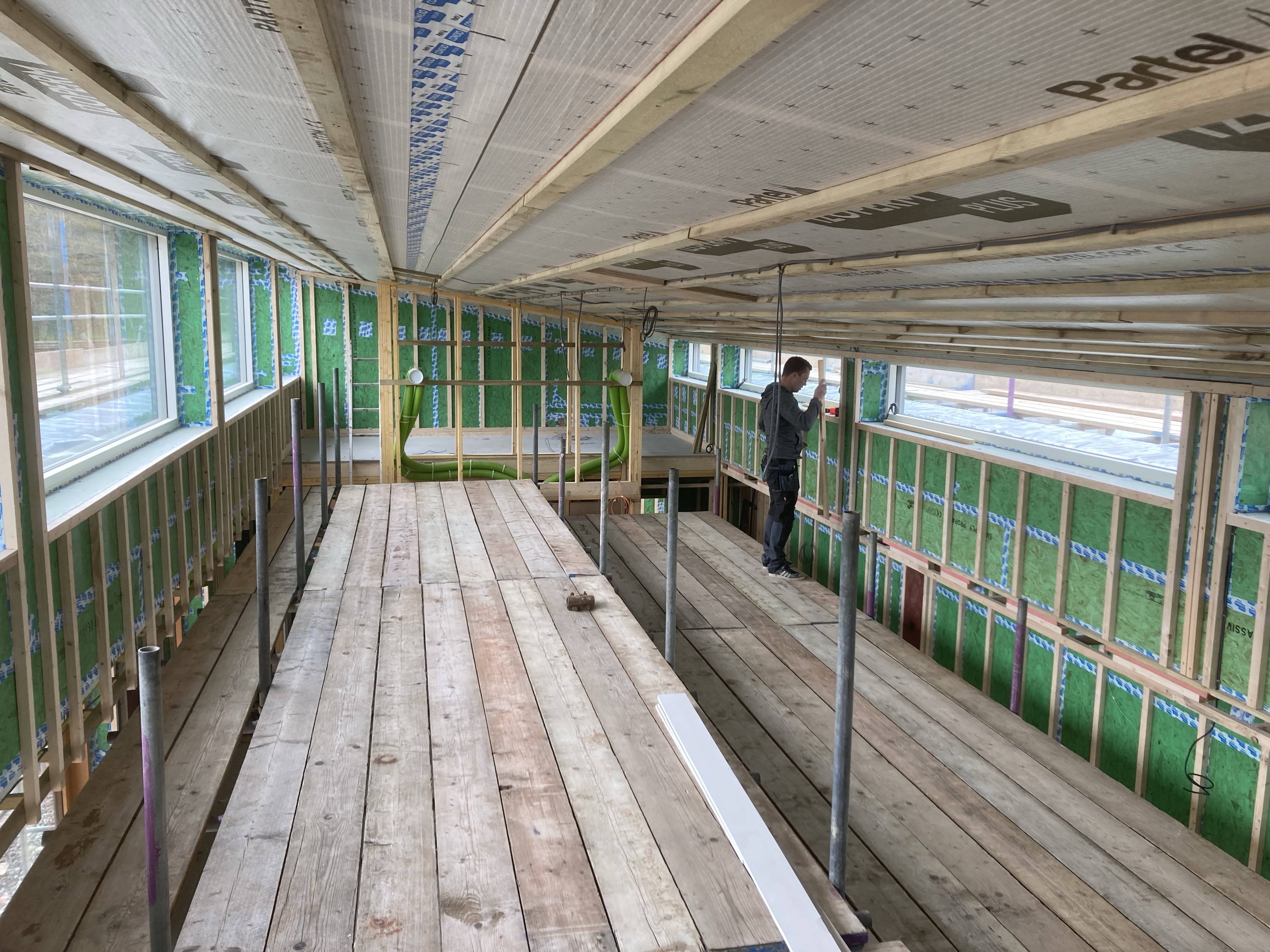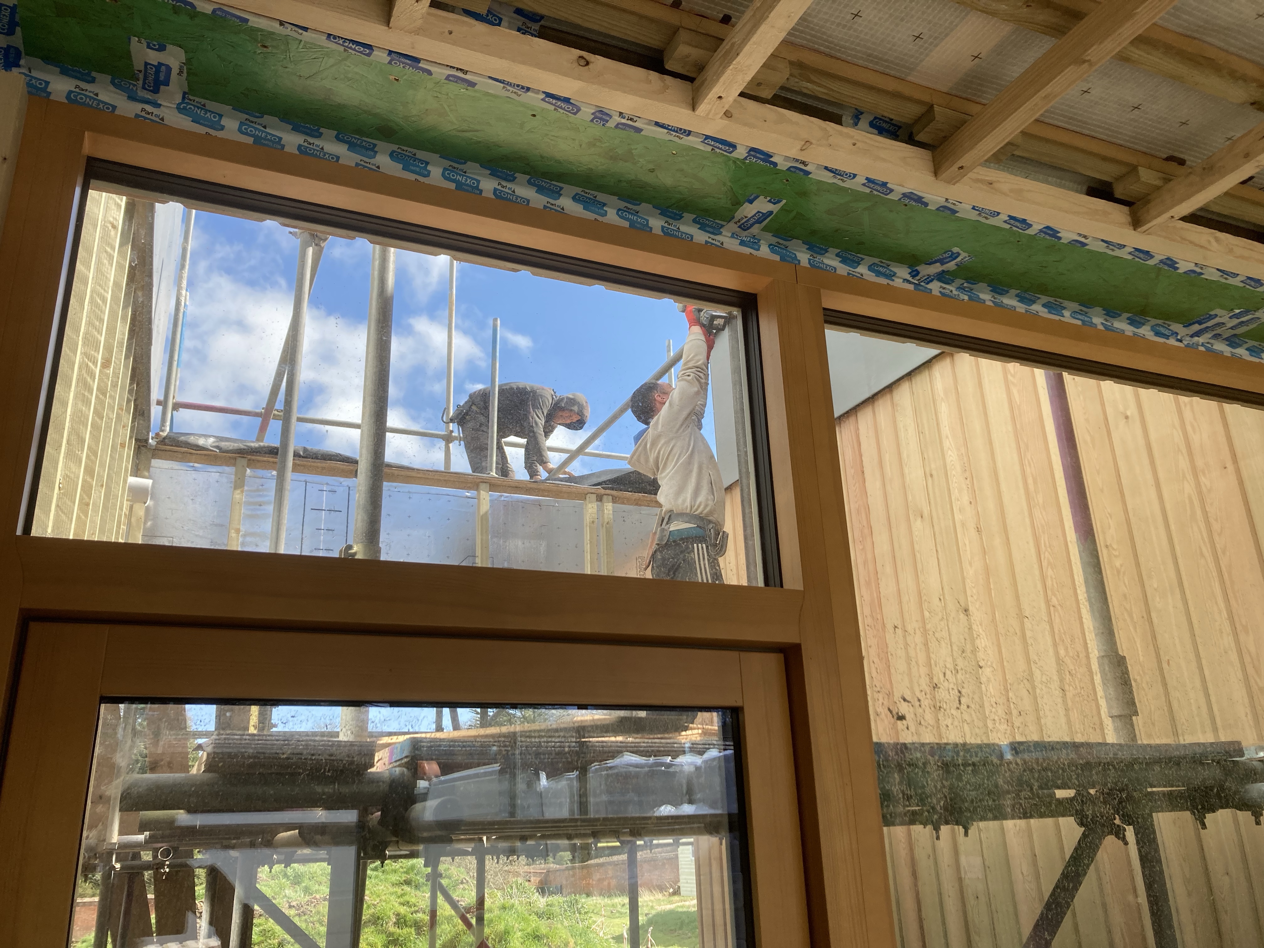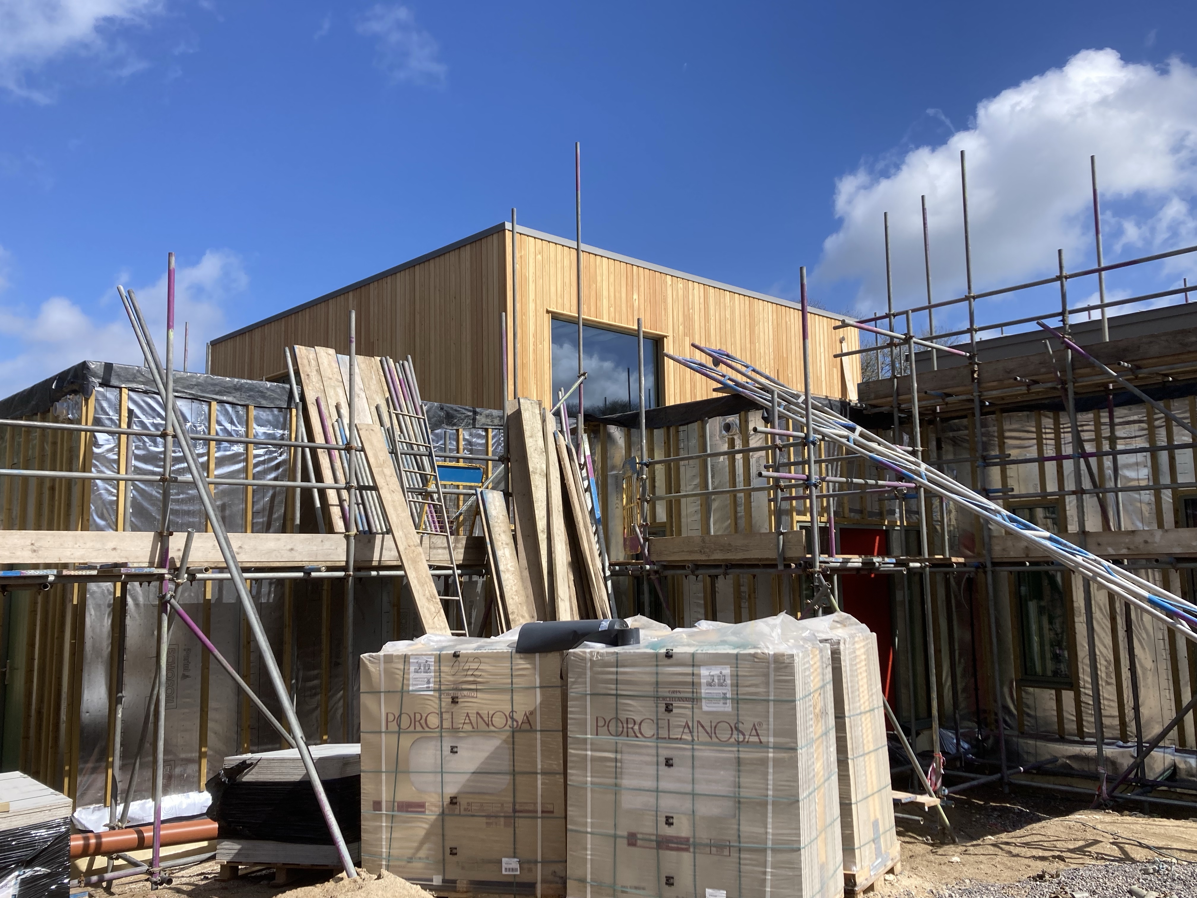Onwards and Upwards, our scaffolders, have taken down some, but only some, of the higher level scaffold, revealing the larch-clad upstairs and letting more light into the courtyards. There’s a lot more scaffold to come down but they’re in no rush, and will use us as free storage until they have another job nearby. They’ve put up a platform in the dayroom to give safer access for plasterers, decorators and others to reach the high ceiling.
