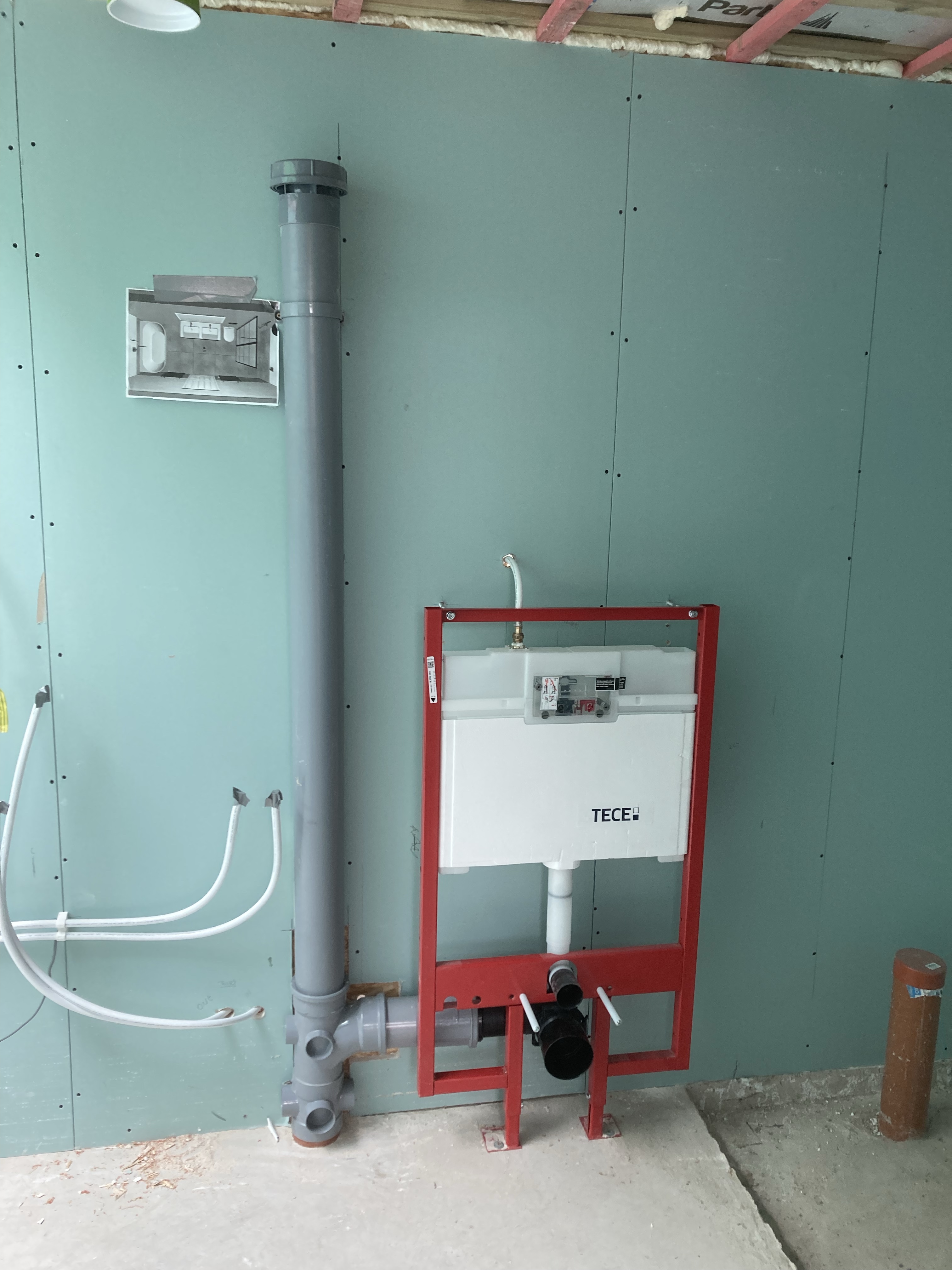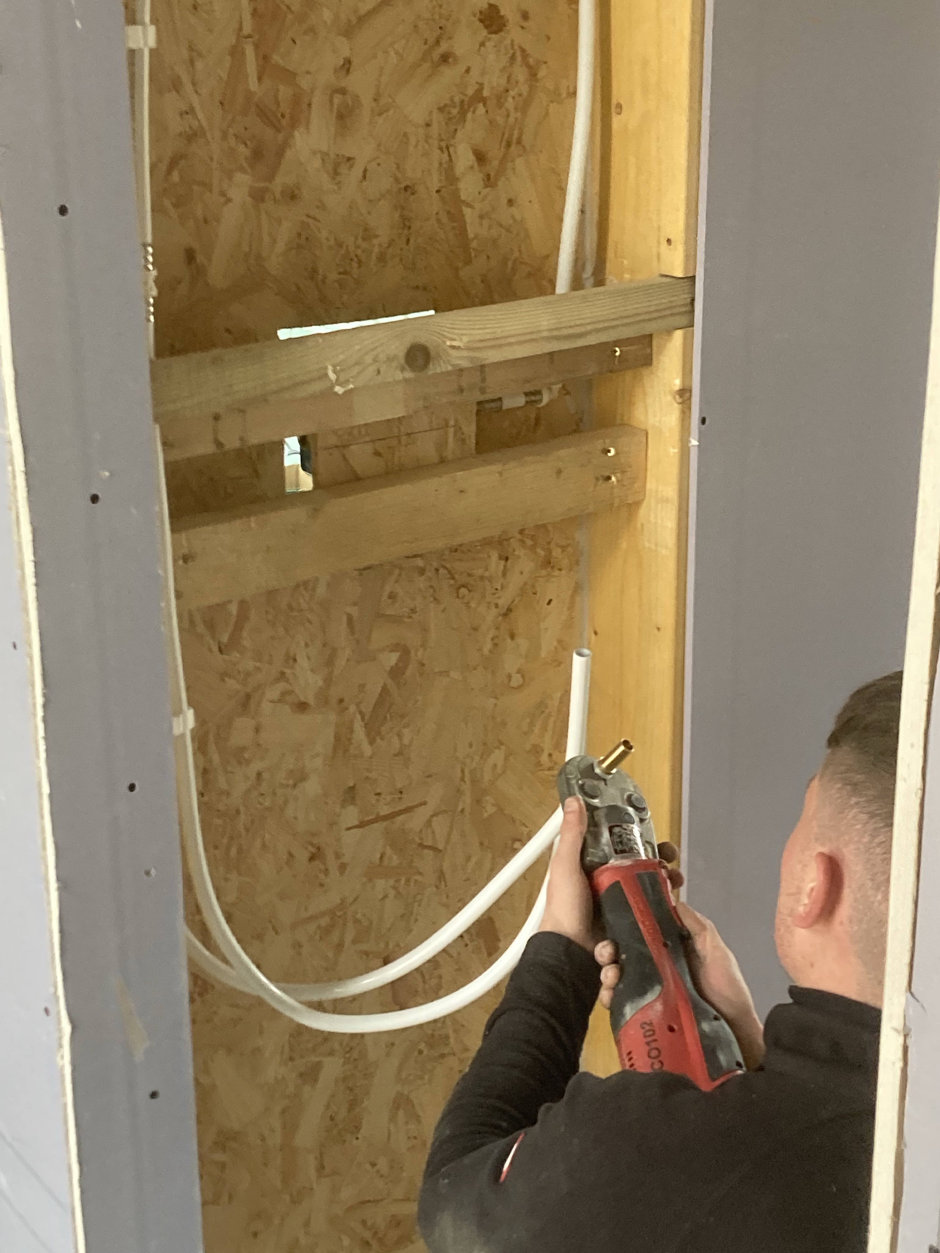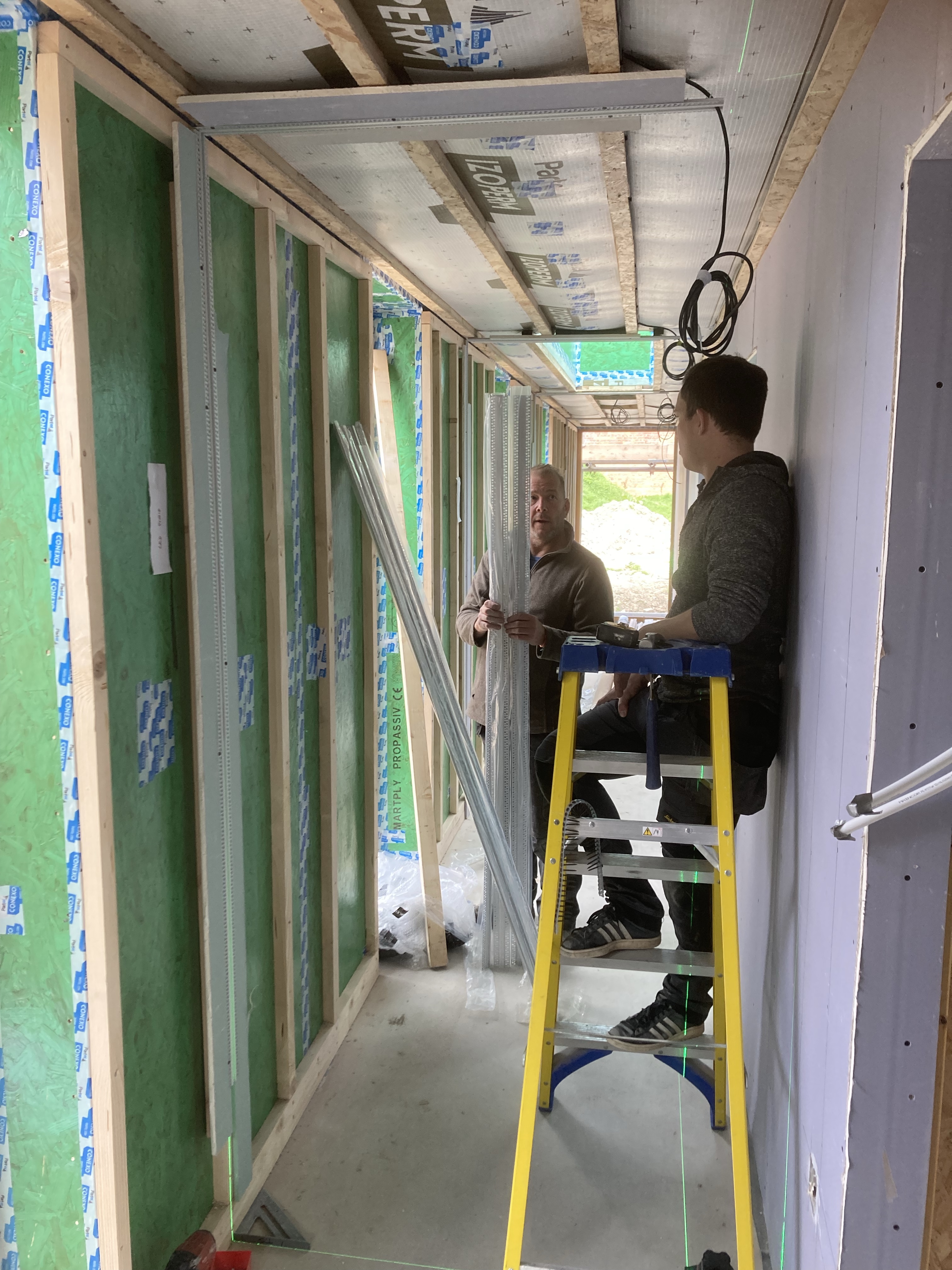 As Aaron and Tony finish the electrics first fix, James the plumber gets going on setting out the bathrooms and pipework. Once these guys have finished a room, Taff can move in and get plasterboard onto the walls and ceilings.