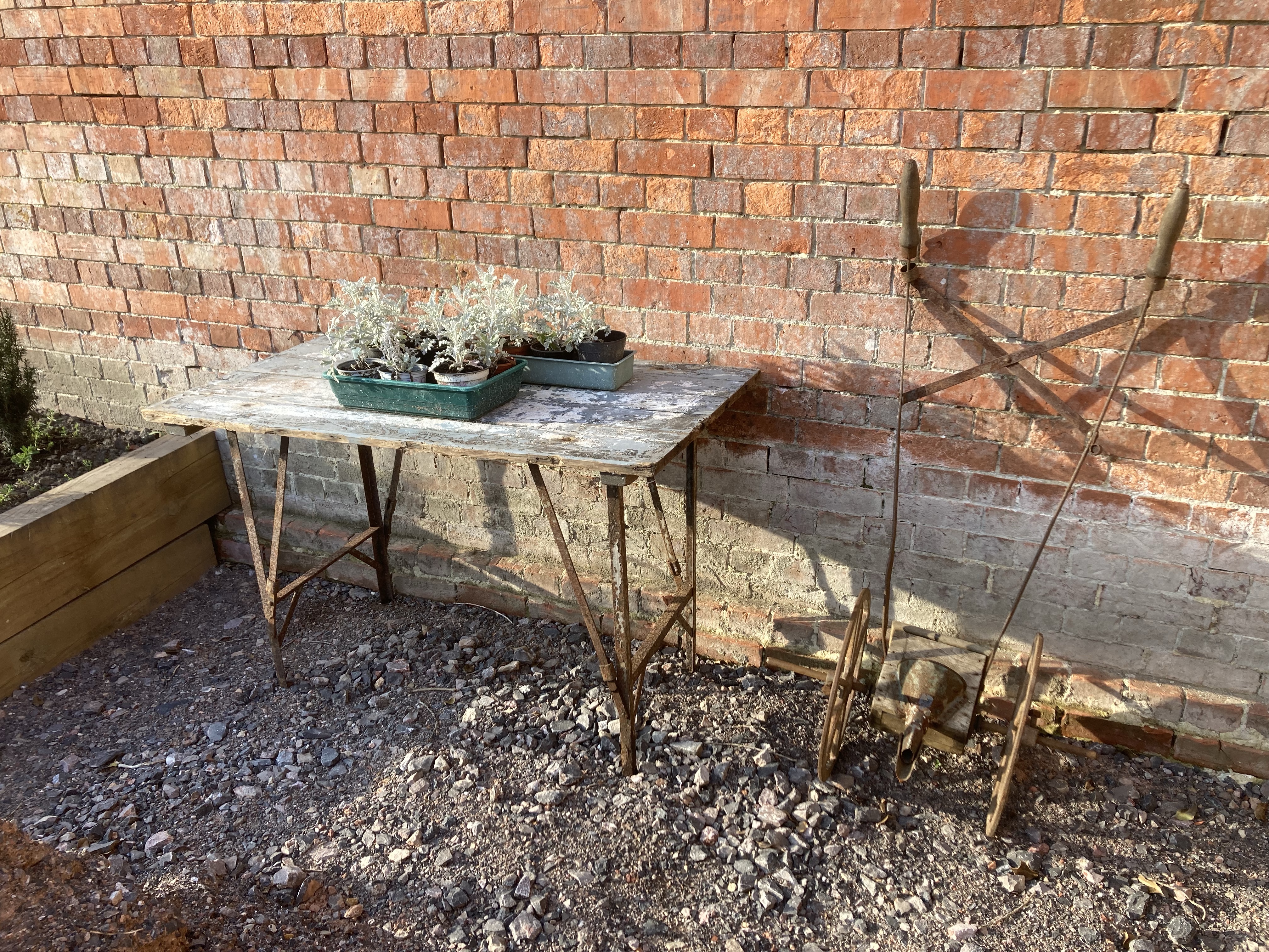 Our accumulation of ‘tat’ around the bothy is coming along. This includes a characterful seed drill kindly given to us by Chris’ Mum’s gardener, Kevin, and a metal florist’s table from a local antiques place.