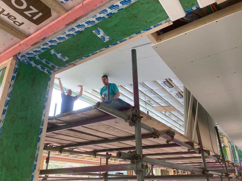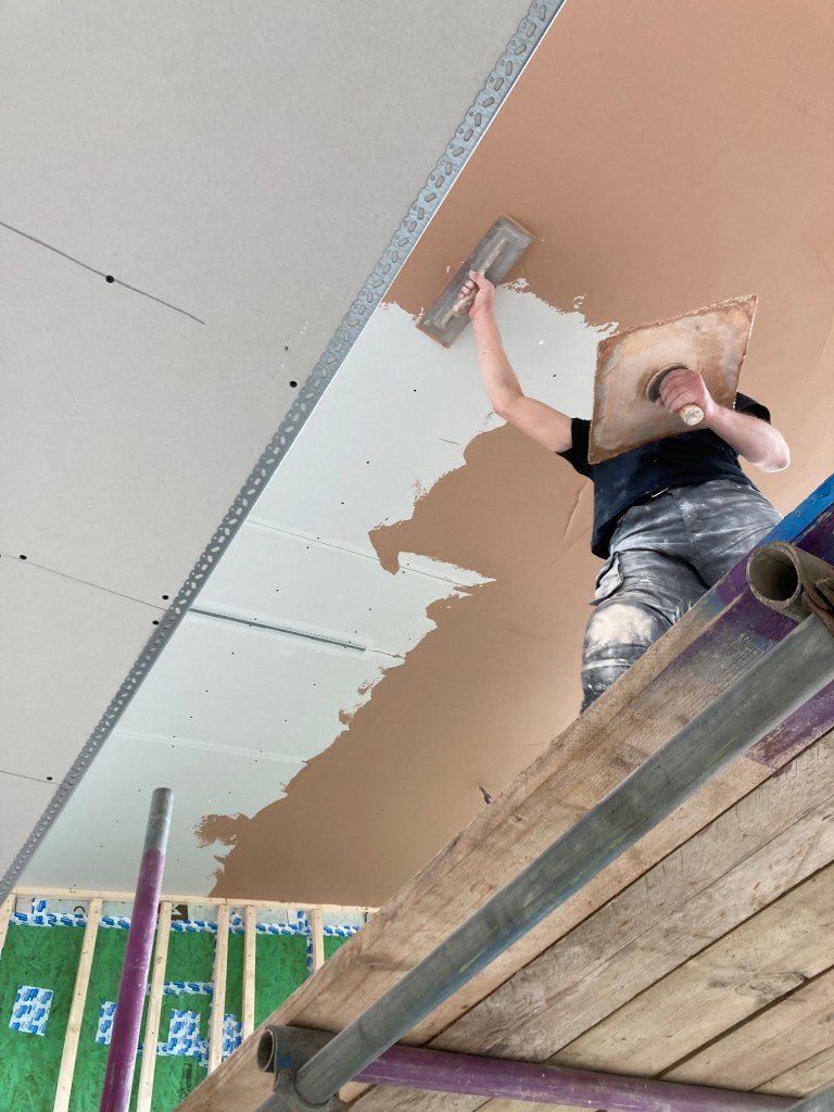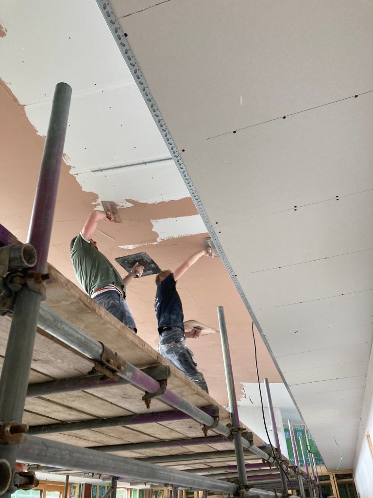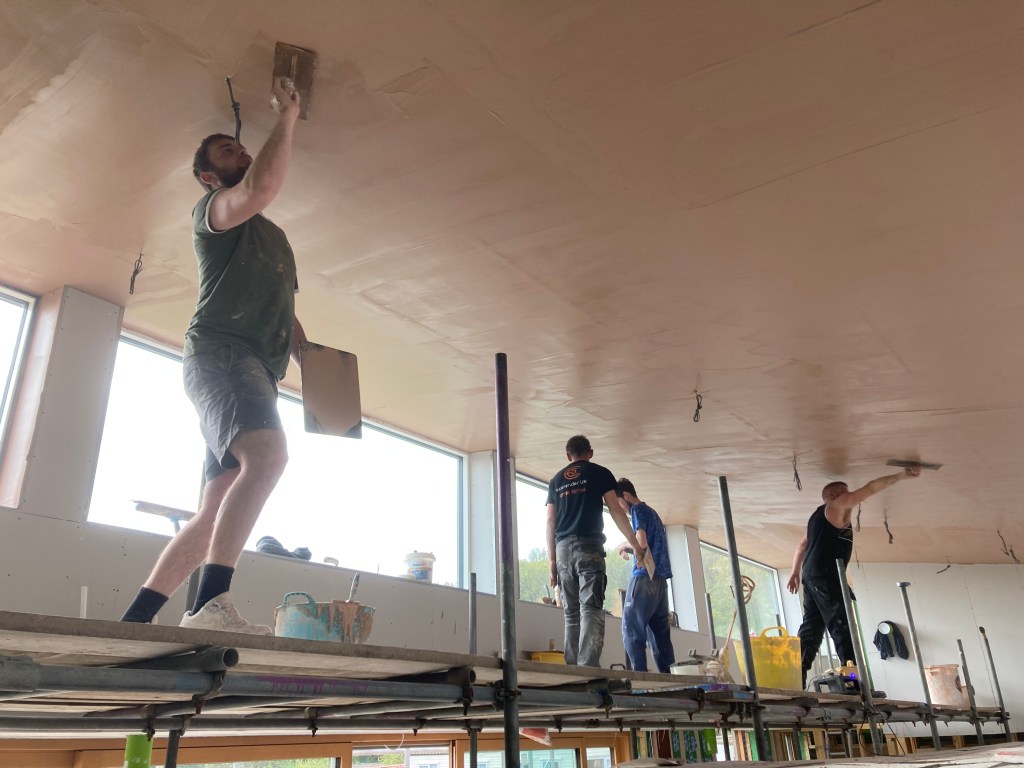Inside all attention is on plasterboarding and plastering, especially in the main high-level room which has the scaffold platform – up to five plasterers at once when tackling the bigger areas.
