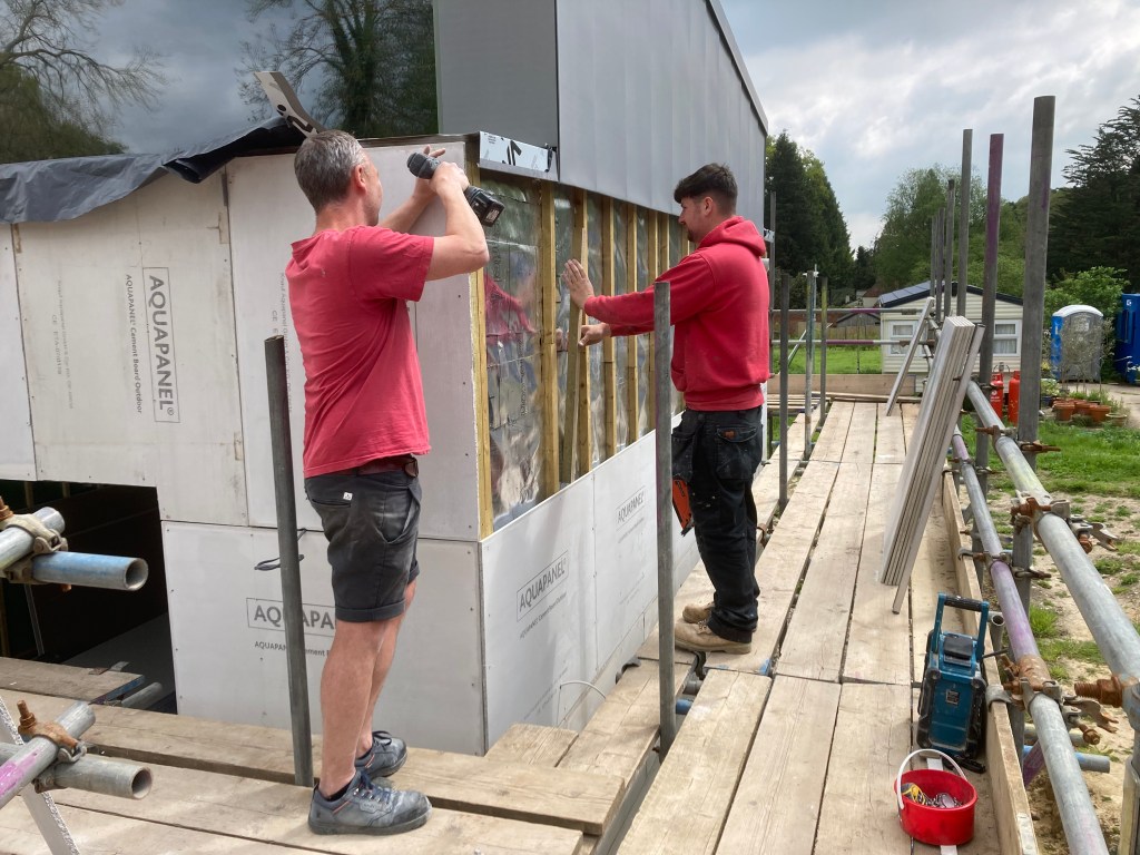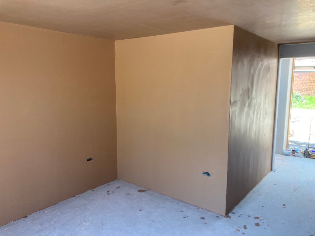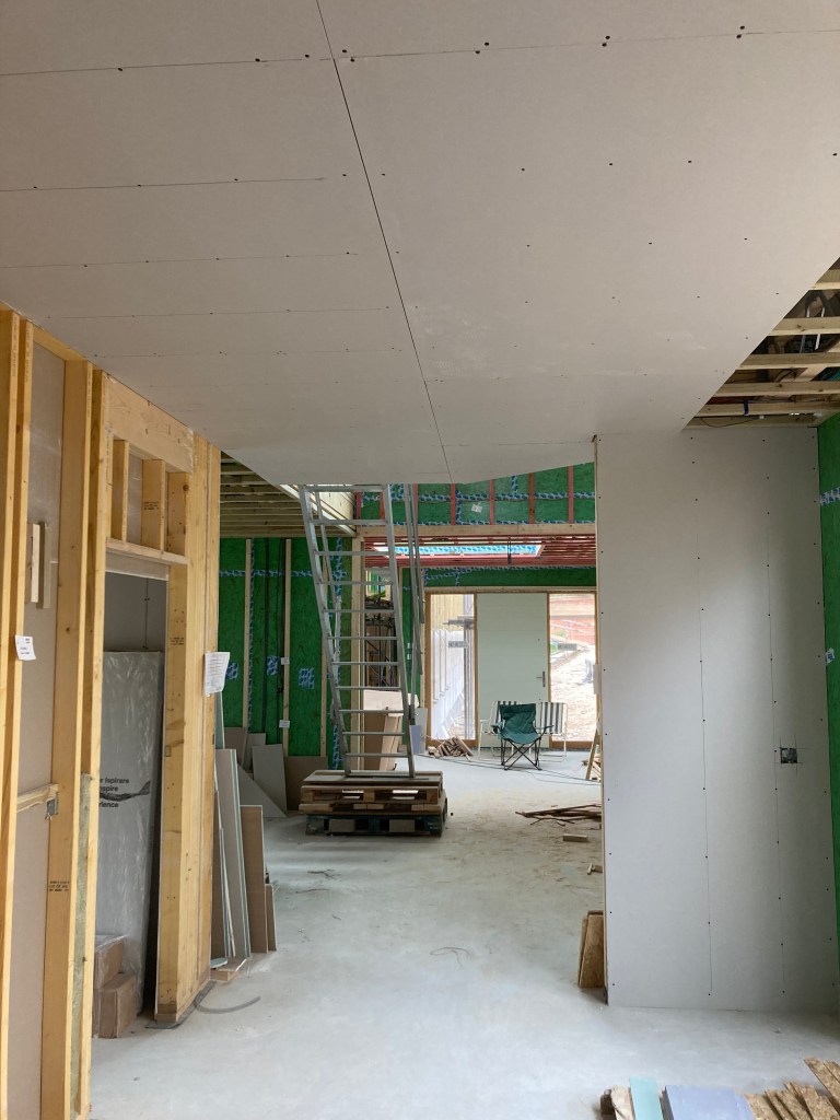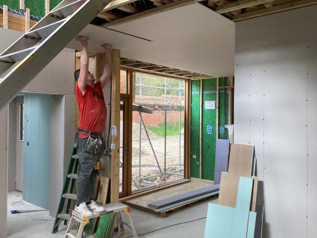 Inside all attention is on plasterboarding and plastering, especially in the main high-level room which has the scaffold platform – up to five plasterers at once when tackling the bigger areas.