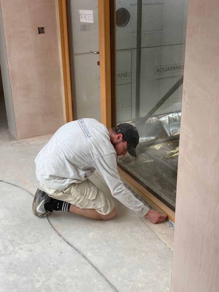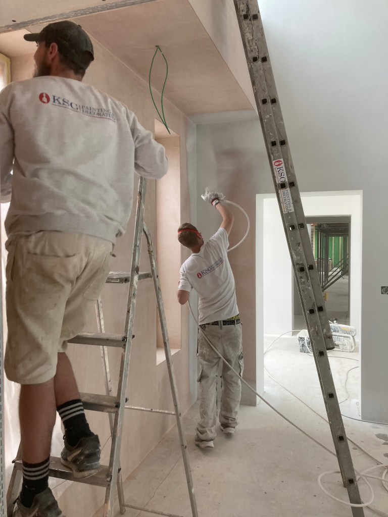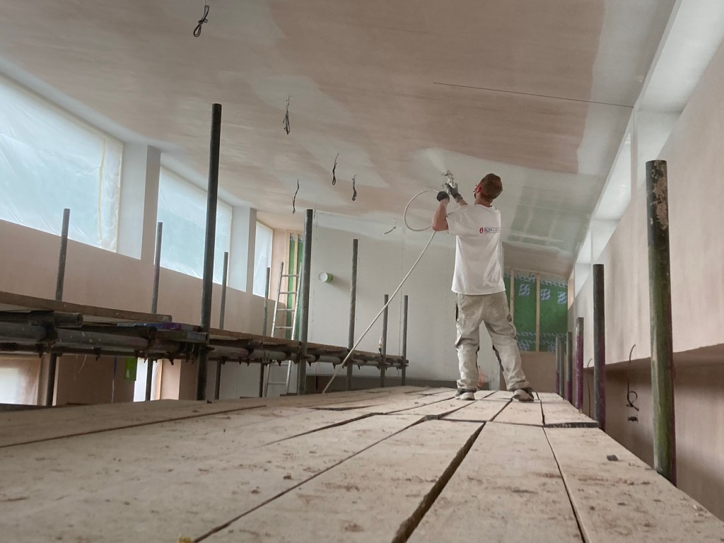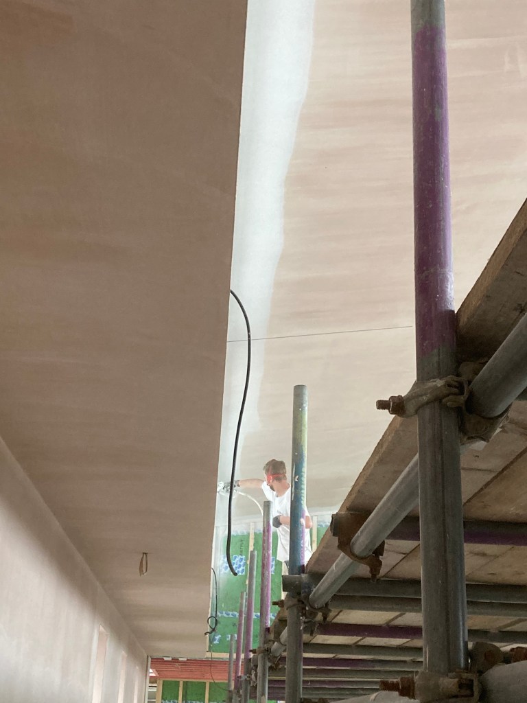A good stride forwards today as some paint starts going on walls and ceilings. We wanted the high ceiling in the day room painted while the platform was still up and, via Aaron the electrician, we came across paint sprayers, Kieran, James and James. It’s so quick!