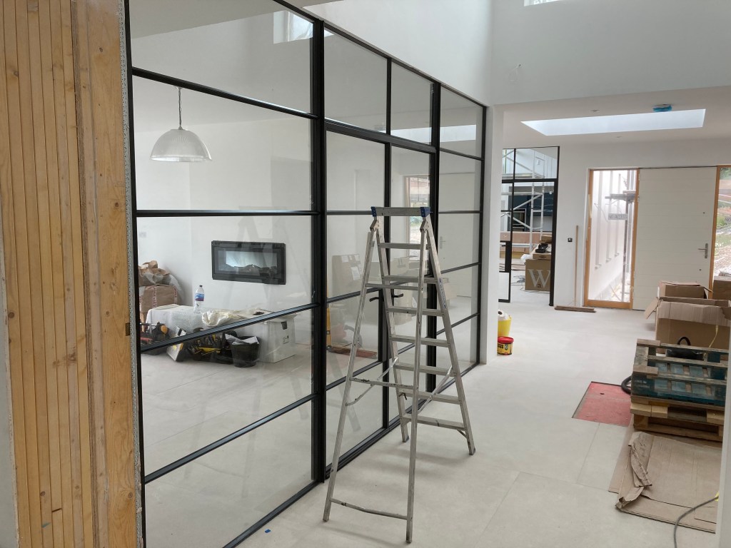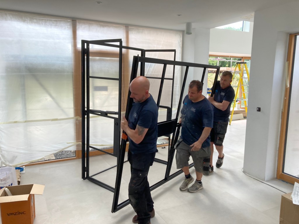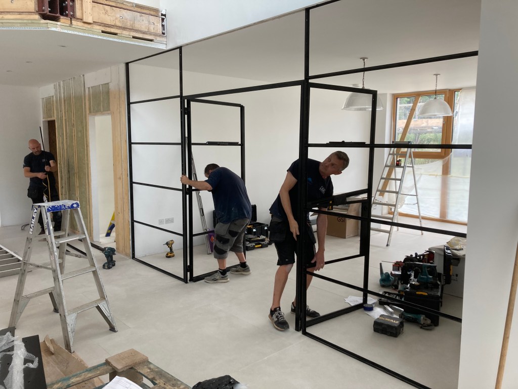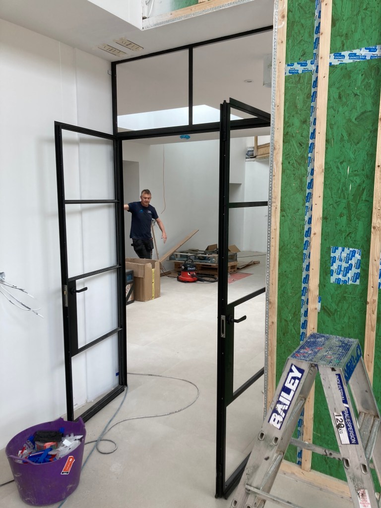 We’ve enjoyed the openness of the house, and in particular the hall, as the white-walled space has emerged from the concrete slab and timber frame. We had therefore been slightly nervous of the impact of the two Crittall screens – one between the hall and the sitting room, the other between the hall and the dayroom – that we ordered off plan about a year ago. But they’re in (at a pinch and with a squeeze) and we like them very much.