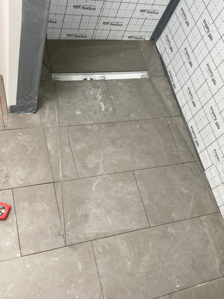 And the shower tiling’s finished with some challenging geometry and cutting by Dean and Matt …