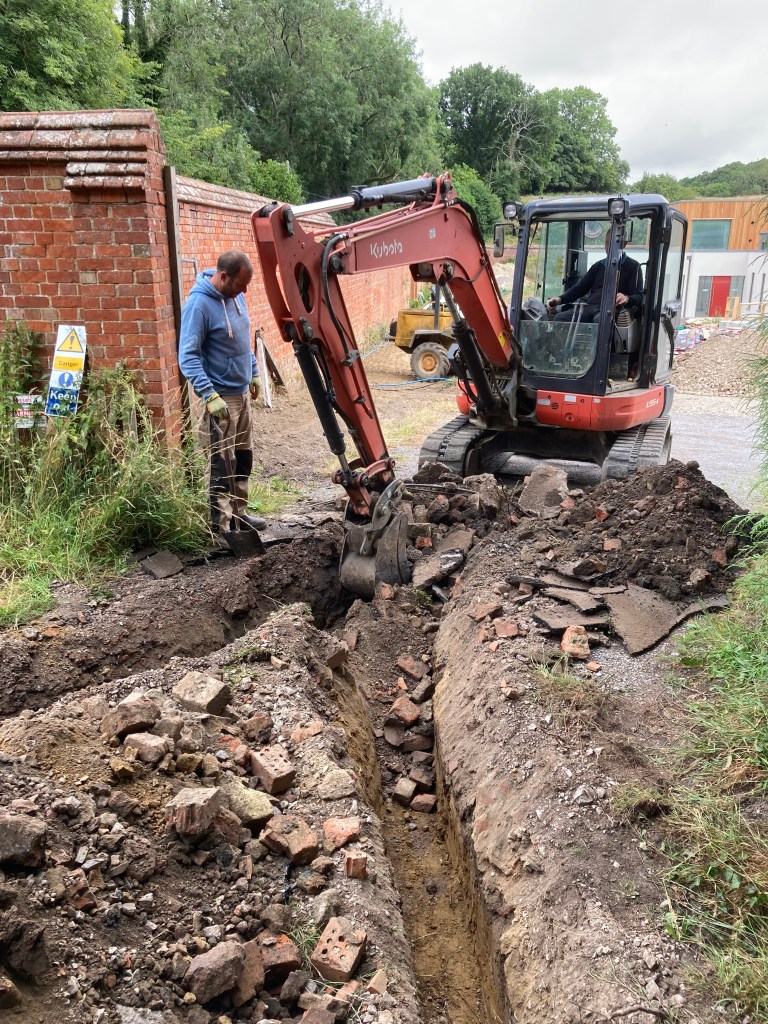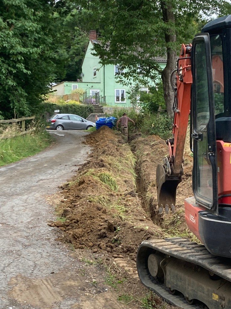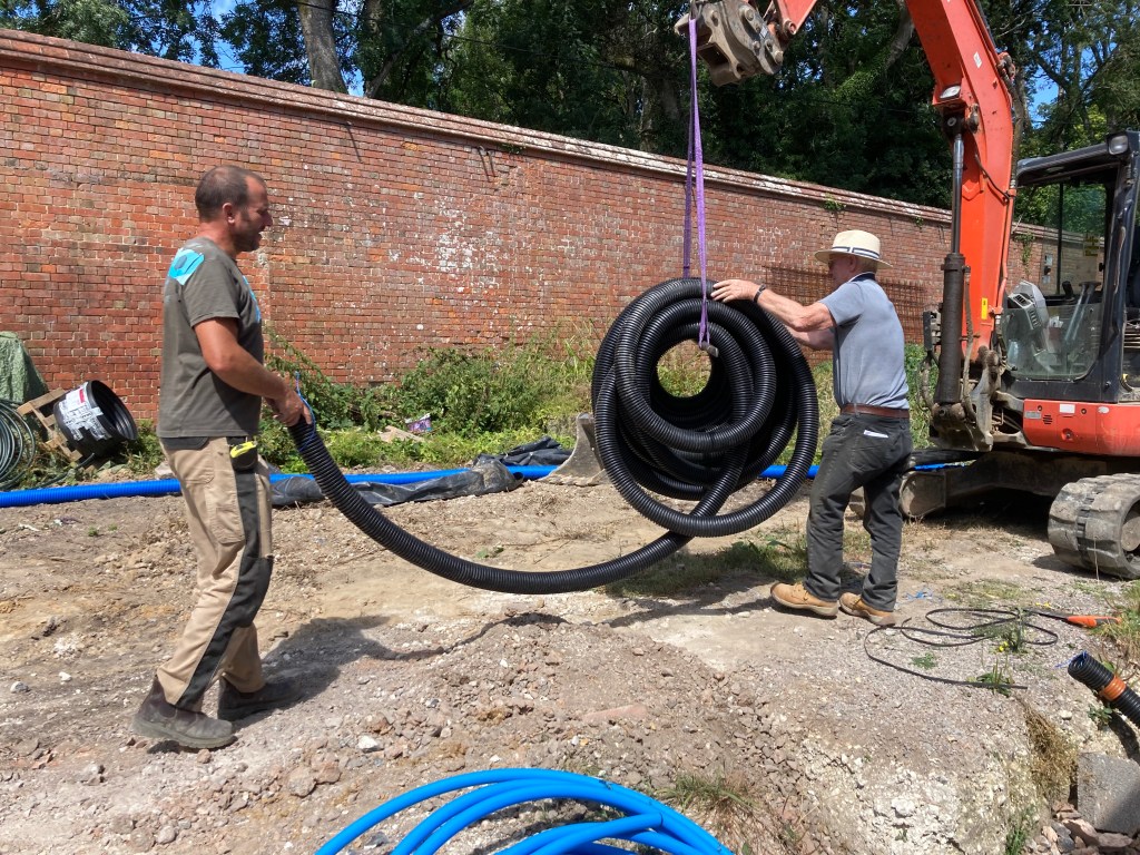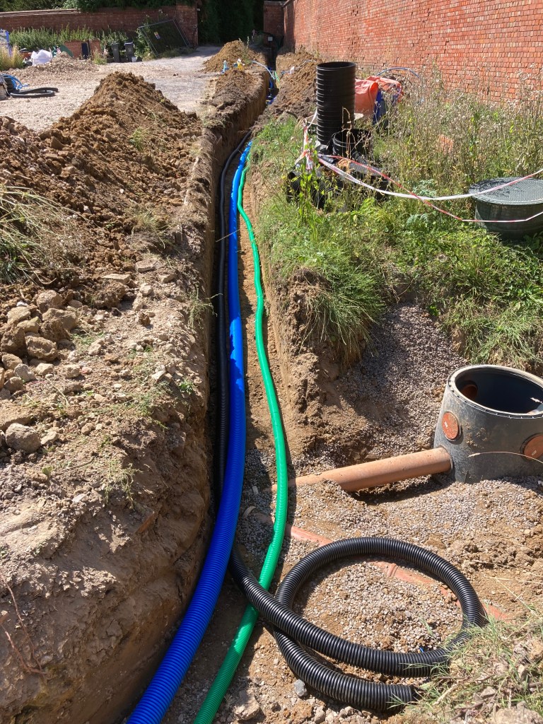 But the main tasks for them are connecting up the sewer, putting in a new water supply, some land drains under the drive area, ducting for outside power, and the rainwater collection drainage to feed the tank. There are trenches, ducts and pipes of every colour going in every direction!