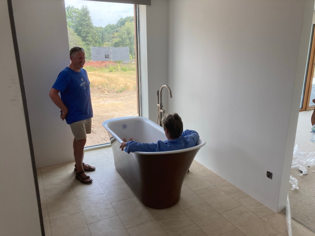 We feel the end is in sight and some things are actually getting finished. We’re spurred on and encouraged by visitors – including this week, a couple of the Fat Blokes, Jon (with Kathy) and Dave (with Jenny and the girls). We’ve also had the blinds going in and general water-related progress.