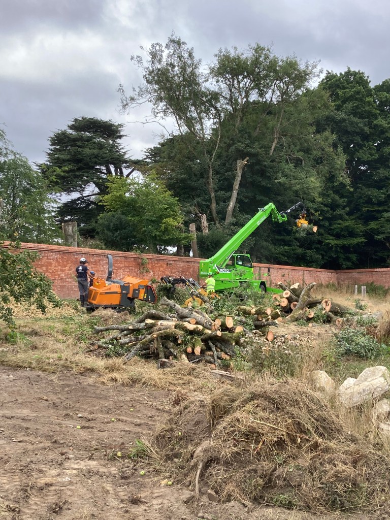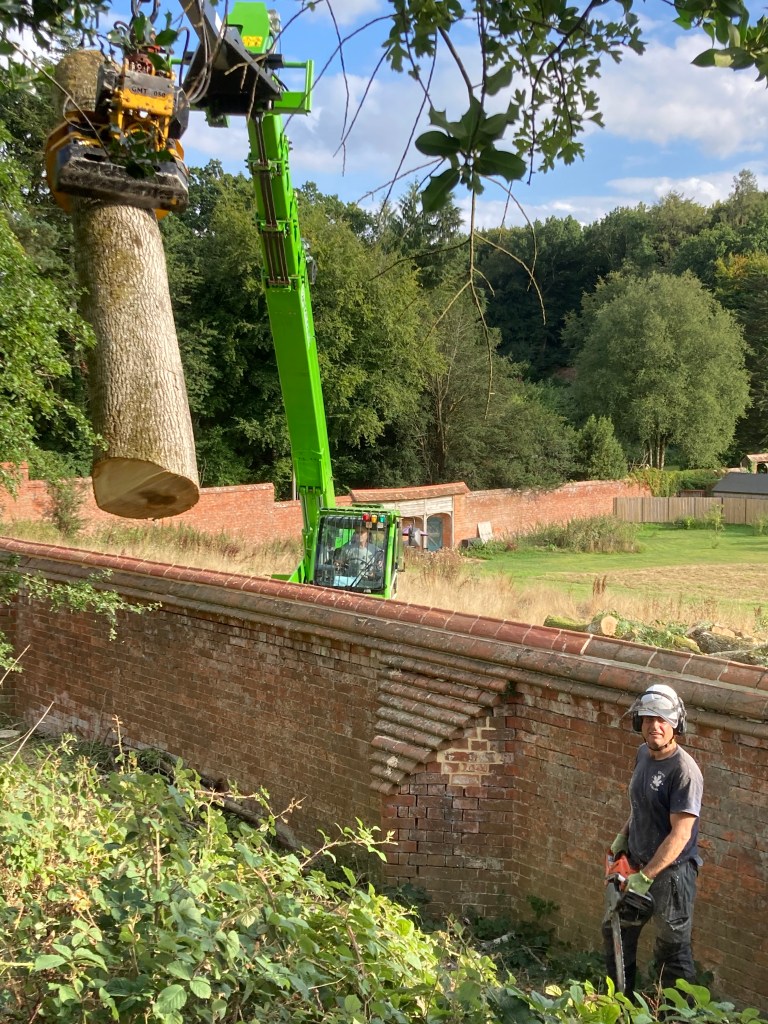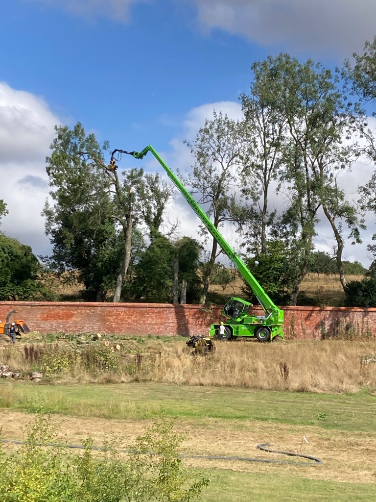 With a heavy heart, Bev agreed that the row of die-back ash along the north wall needed to be felled. The self-sown trees were showing clear signs of the disease and the branches were becoming brittle and therefore dangerous to climb. In the event, tree surgeon Mark hired in an impressive piece of kit, called Merlo, which after a stuttering start devoured the nine trees in a day, something that would have taken perhaps four using a traditional climbing approach.